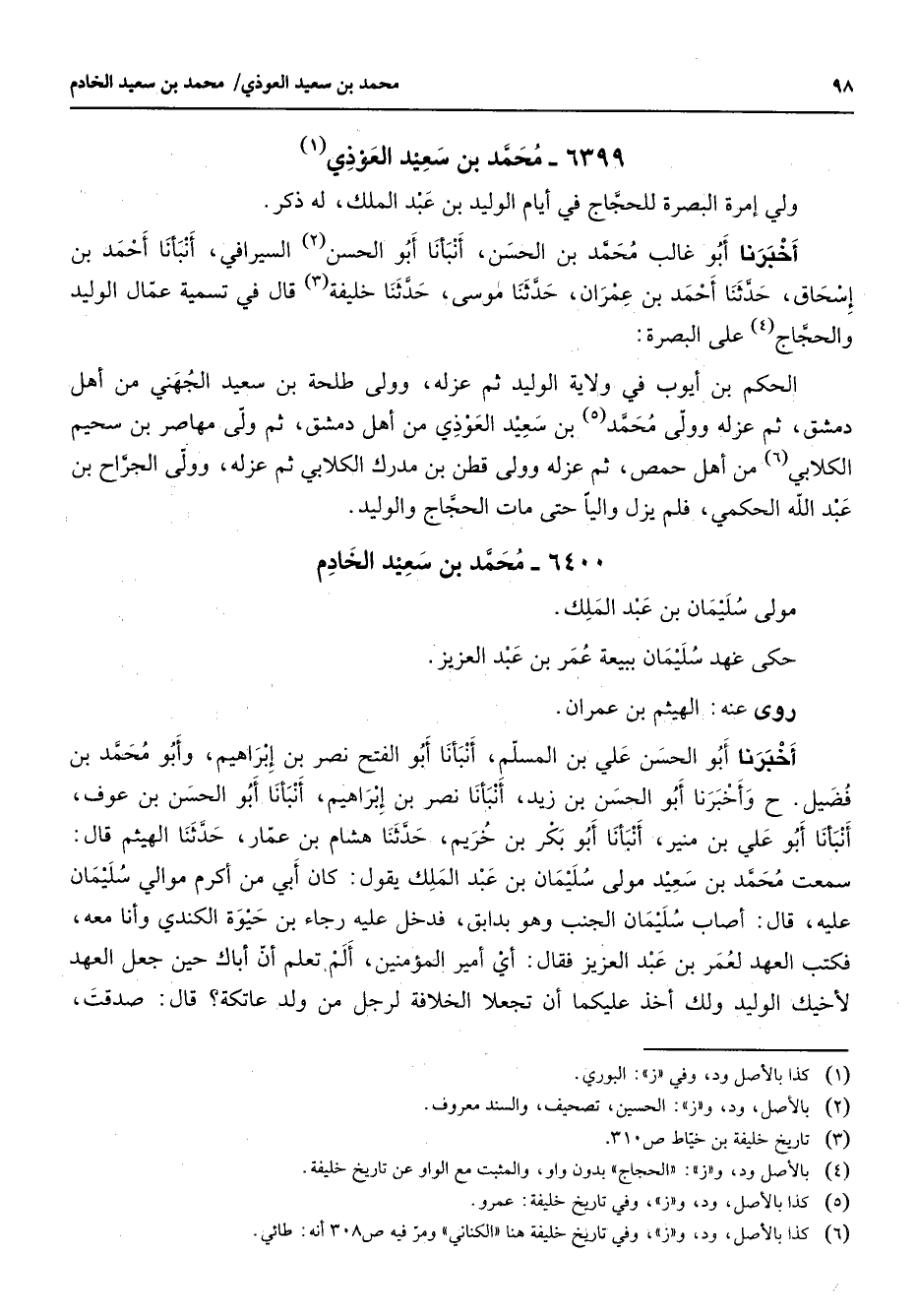6399 - محمد بن سعيد العوذي (1) ولي إمرة البصرة للحجاج في أيام الوليد بن عبد الملك له ذكر أخبرنا أبو غالب محمد بن الحسن أنبأنا أبو الحسن (2) السيرافي أنبأنا أحمد بن إسحاق حدثنا أحمد بن عمران حدثنا موسى حدثنا خليفة (3) قال في تسمية عمال الوليد والحجاج (4) على البصرة الحكم بن أيوب في ولاية الوليد ثم عزله وولى طلحة بن سعيد الجهني من أهل دمشق ثم عزله وولى محمد (5) بن سعيد العوذي من أهل دمشق ثم ولى مهاصر بن سحيم الكلابي (6) من أهل حمص ثم عزله وولى قطن بن مدرك الكلابي ثم عزله وولى الجراح بن عبد الله الحكمي فلم يزل واليا حتى مات الحجاج والوليد