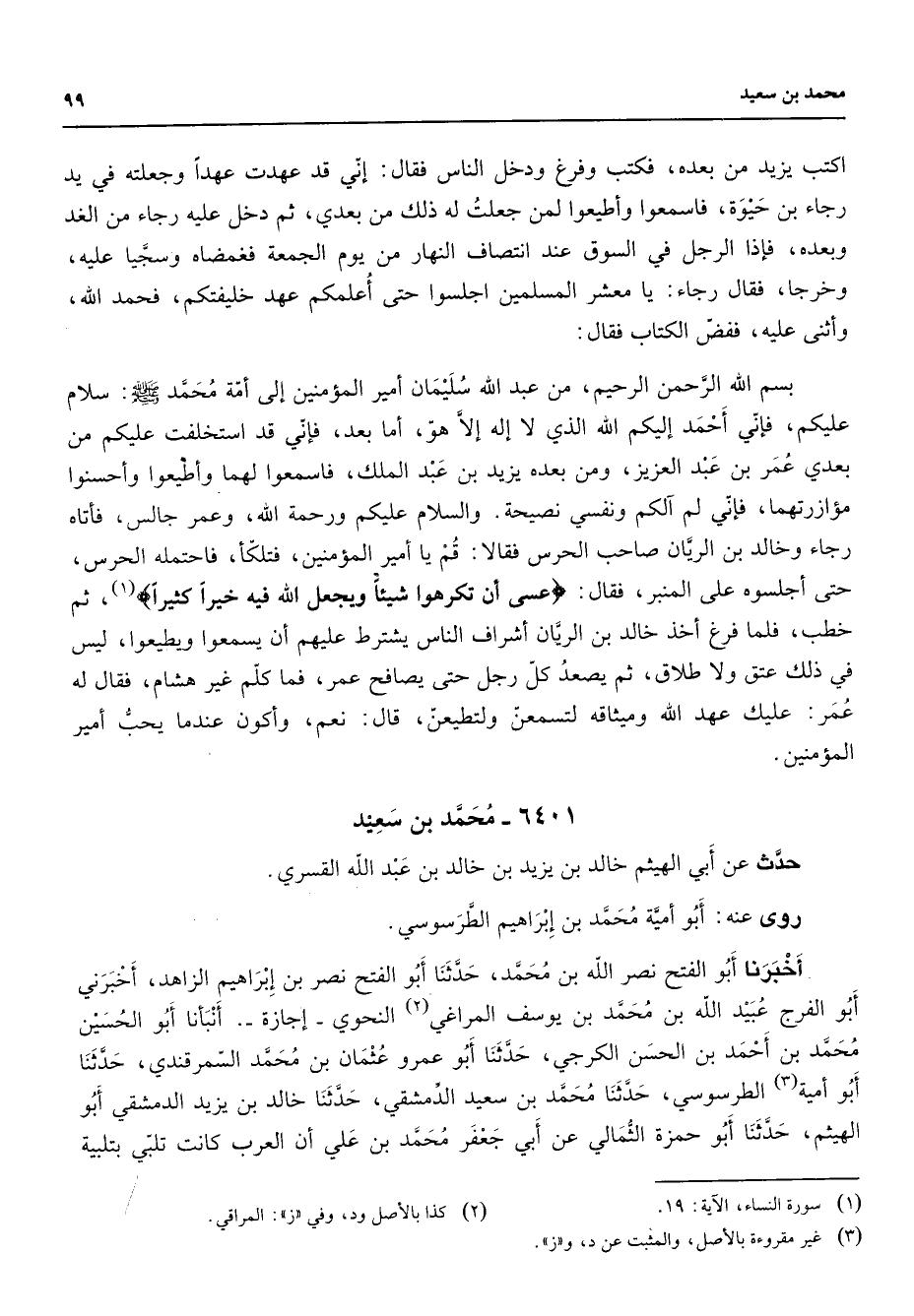 6401 - محمد بن سعيد حدث عن أبي الهيثم خالد بن يزيد بن خالد بن عبد الله القسري روى عنه أبو أمية محمد بن إبراهيم الطرسوسي أخبرنا أبو الفتح نصر الله بن محمد حدثنا أبو الفتح نصر بن إبراهيم الزاهد أخبرني أبو الفرج عبيد الله بن محمد بن يوسف المراغي (2) النحوي إجازة أنبأنا أبو الحسين محمد بن أحمد بن الحسن الكرجي حدثنا أبو عمرو عثمان بن محمد السمرقندي حدثنا أبو أمية (3) الطرسوسي حدثنا محمد بن سعيد الدمشقي حدثنا خالد بن يزيد الدمشقي أبو الهيثم حدثنا أبو حمزة الثمالي عن أبي جعفر محمد بن علي أن العرب كانت تلبي بتلبية