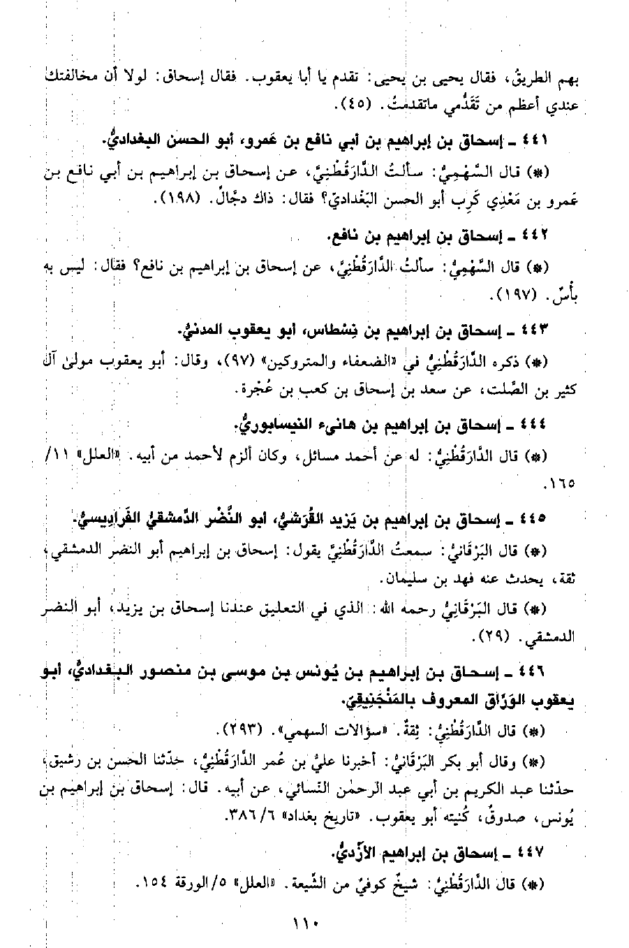 • قال البرقاني: سمعت الدَّارَقُطْنِيّ يقول إسحاق بن إبراهيم أبو النضر الدمشقي، ثقة، يحدث عنه فهد بن سليمان.