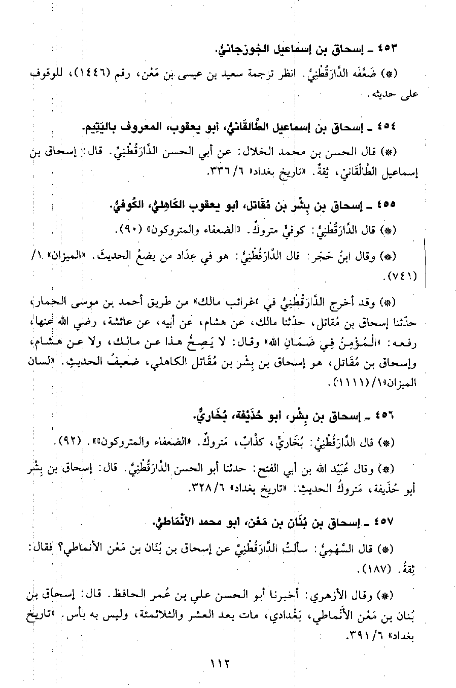 • وقال عبيد الله بن أبي الفتح حدثنا أبو الحسن الدَّارَقُطْنِيّ، قال إسحاق بن بشر أبو حذيفة، متروك الحديث. «تاريخ بغداد» 6 328.