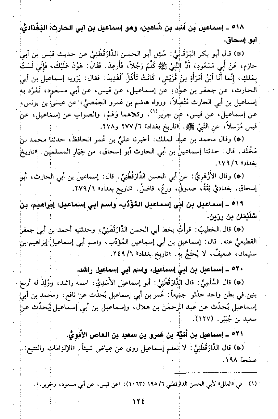 • قال الخطيب: قرأت بخط أبي الحسن الدَّارَقُطْنِيّ، وحدثنيه أحمد بن أبي جعفر القطيعي عنه، قال إسماعيل بن أبي إسماعيل المؤدب، واسم أبي إسماعيل إبراهيم بن سليمان، ضعيف، لا يحتج به. «تاريخ بغداد» 6 249.