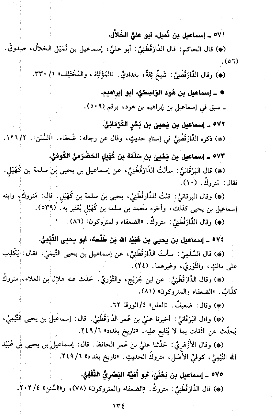 • قال البرقاني: سألت الدَّارَقُطْنِيّ، عن إسماعيل بن يحيى بن سلمة بن كهيل، فقال: متروك. (10) .