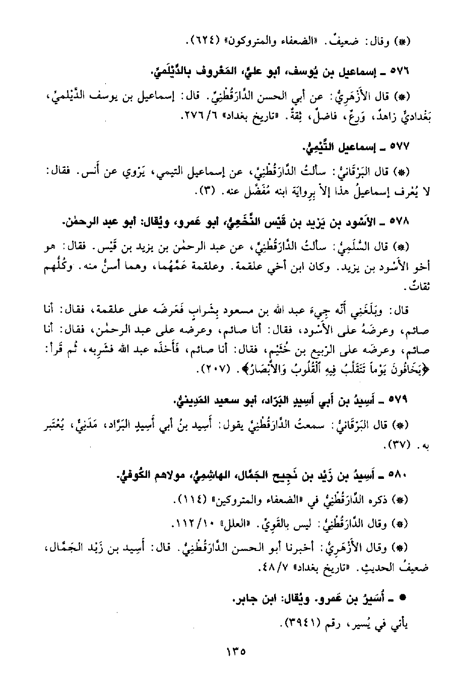 • قال البرقاني: سألت الدَّارَقُطْنِيّ، عن إسماعيل التيمي، يروي عن أنس، فقال: لا يعرف إسماعيل هذا إلا برواية ابنه مفضل عنه. (3) .