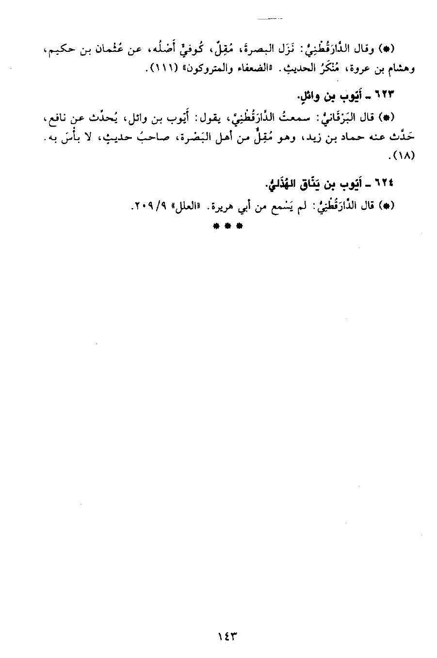 • وقال الدَّارَقُطْنِيّ: نزل البصرة، مقل، كوفي أصله، عن عثمان بن حكيم، وهشام بن عروة منكر الحديث. «الضعفاء والمتروكون» (111) .
