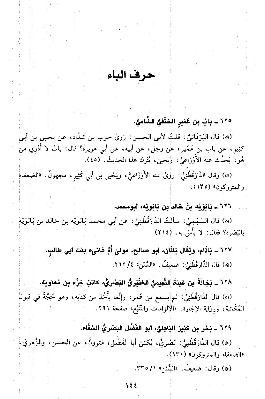 • قال البرقاني: قلت لأبي الحسن روى حرب بن شداد عن يحيى بن أبي كثير، عن باب بن عمير، عن رجل، عن أبيه، عن أبي هريرة؟ قال باب لا أدري من هو، يحدث عنه الأوزاعي، ويحيى، يترك هذا الحديث. (45) .