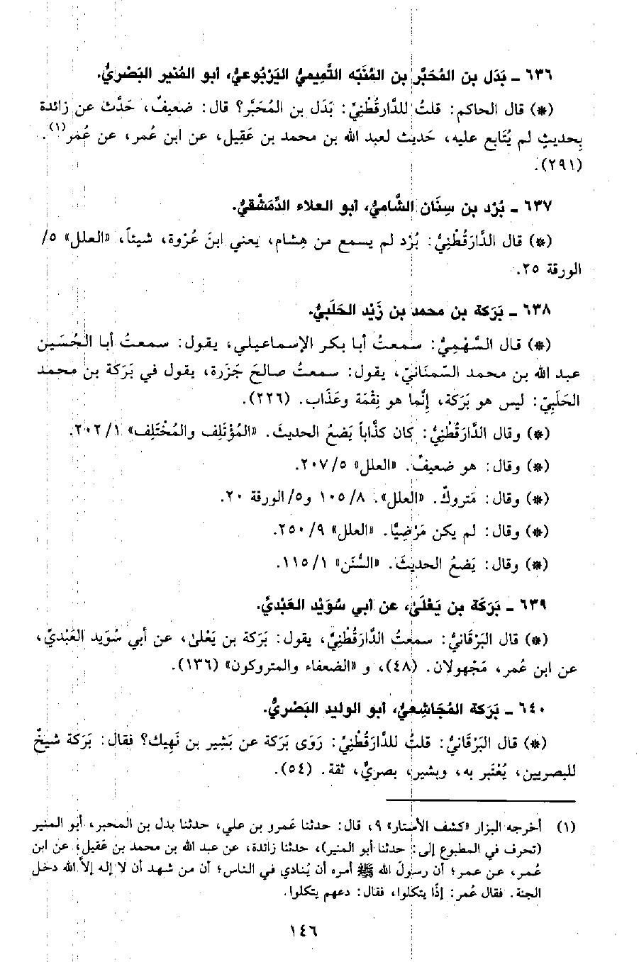 • قال البرقاني: سمعت الدَّارَقُطْنِيّ يقول بركة بن يعلى، عن أبي سويد العبدي، عن ابن عمر، مجهولان. (48) ، و «الضعفاء والمتروكون» (136) .