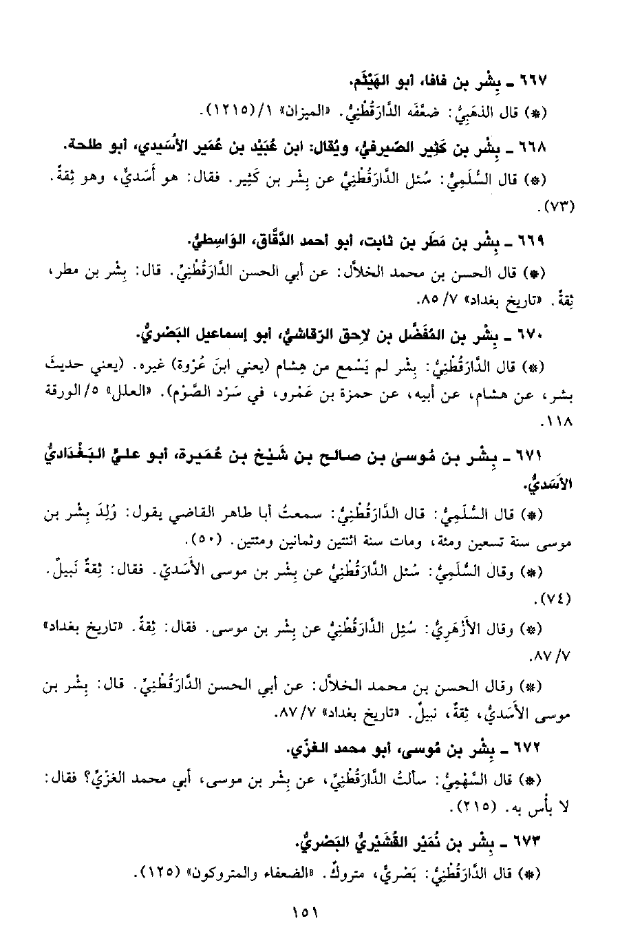 • وقال السلمي: سئل الدَّارَقُطْنِيّ عن بشر بن موسى الأسدي، فقال: ثقة نبيل. (74) .