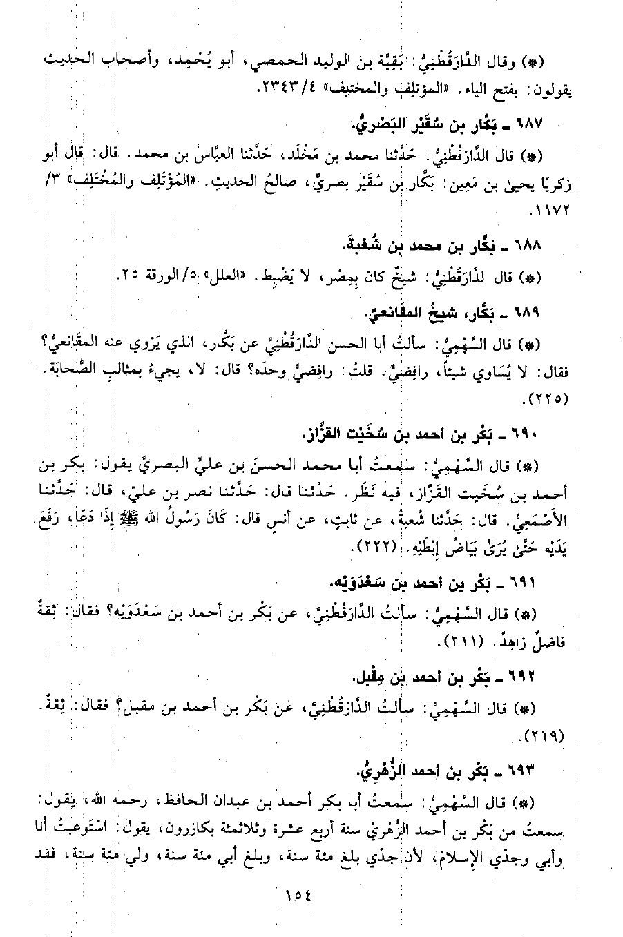 • قال السهمي: سألت أبا الحسن الدَّارَقُطْنِيّ عن بكار، الذي يروي عنه المقانعي؟ فقال: لا يساوي شيئًا، رافضي، قلت رافضي وحده؟ قال لا، يجيء بمثالب الصحابة. (225) .