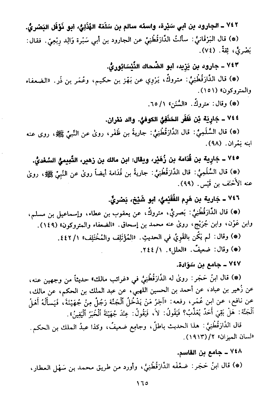 • قال البرقاني: سألت الدَّارَقُطْنِيّ عن الجارود بن أبي سبرة والد ربعي، فقال: بصري، ثقة. (74) .