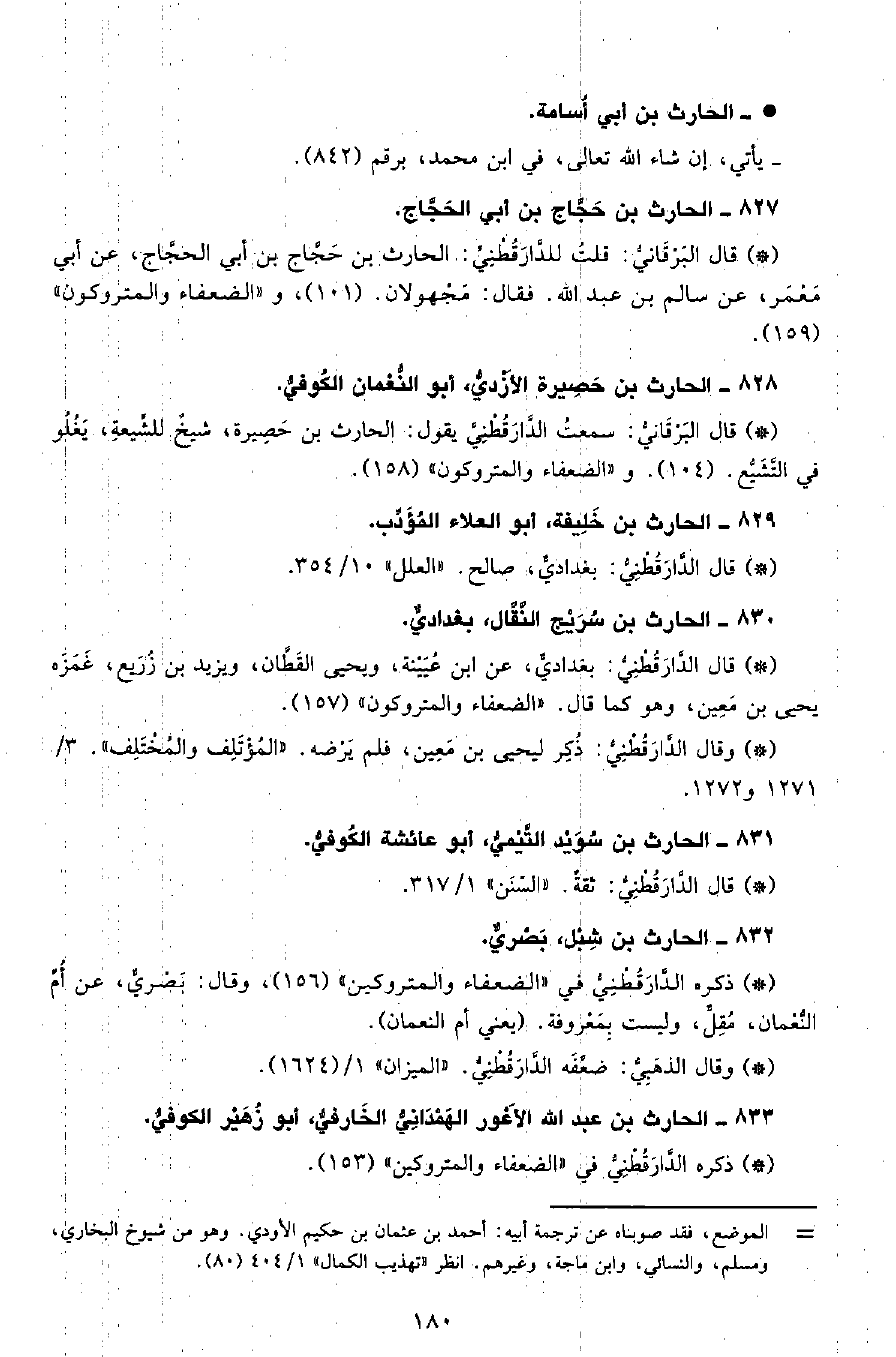 • قال البرقاني: سمعت الدَّارَقُطْنِيّ يقول الحارث بن حصيرة، شيخ للشيعة، يغلو في التشيع. (104) ، و «الضعفاء والمتروكون» (158) .