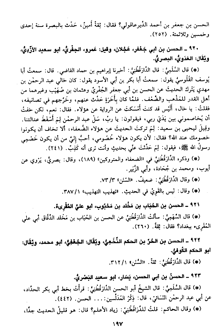 • قال السهمي: سألت الدَّارَقُطْنِيّ عن الحسن بن الحباب بن مخلد الدقاق أبي علي المقرىء ببغداد؟ فقال: ثقة. (260) .