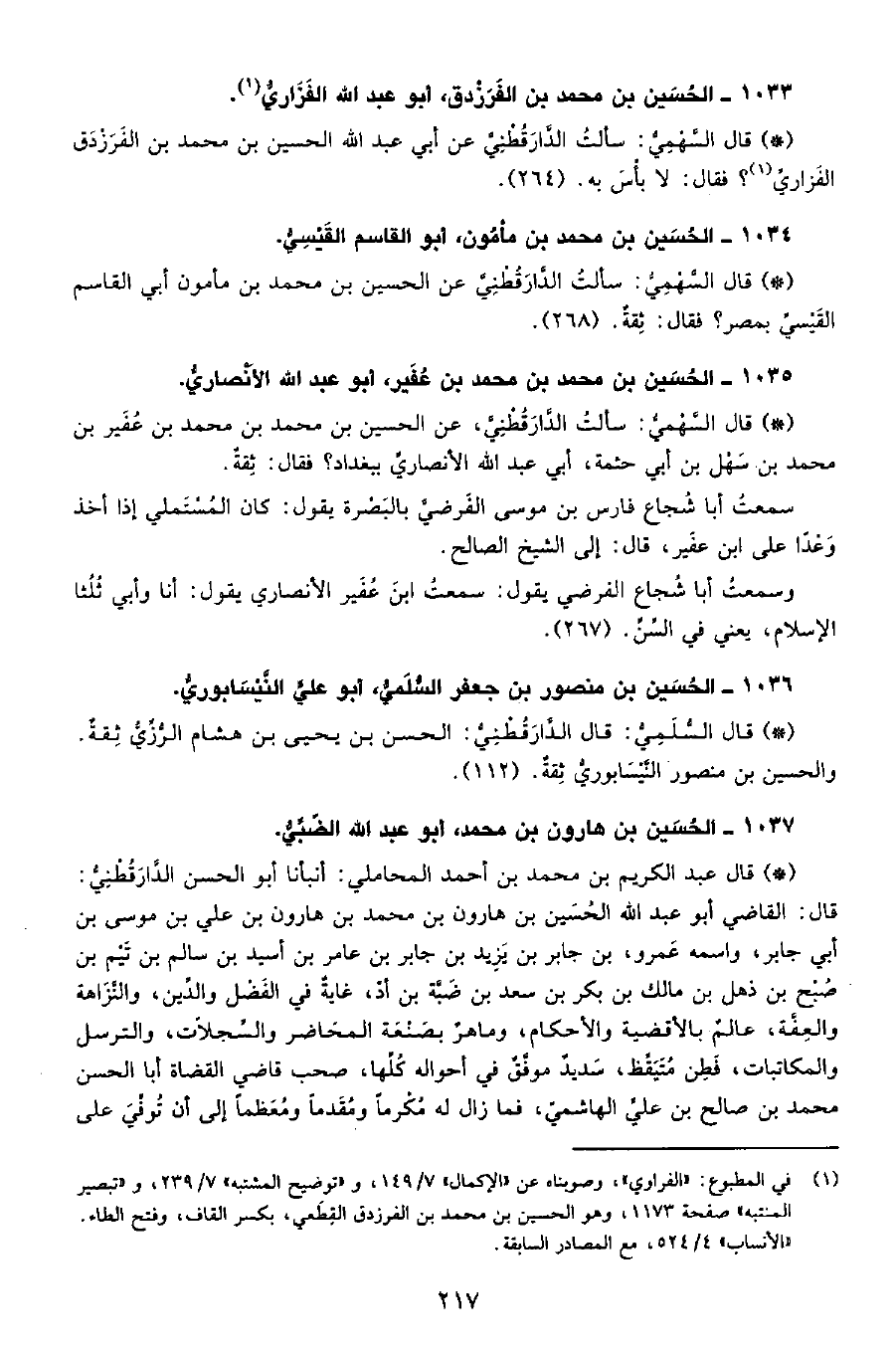 • قال السهمي: سألت الدَّارَقُطْنِيّ عن أبي عبد الله الحسين بن محمد بن الفرزدق الفزاري، فقال: لا بأس به. (264) .