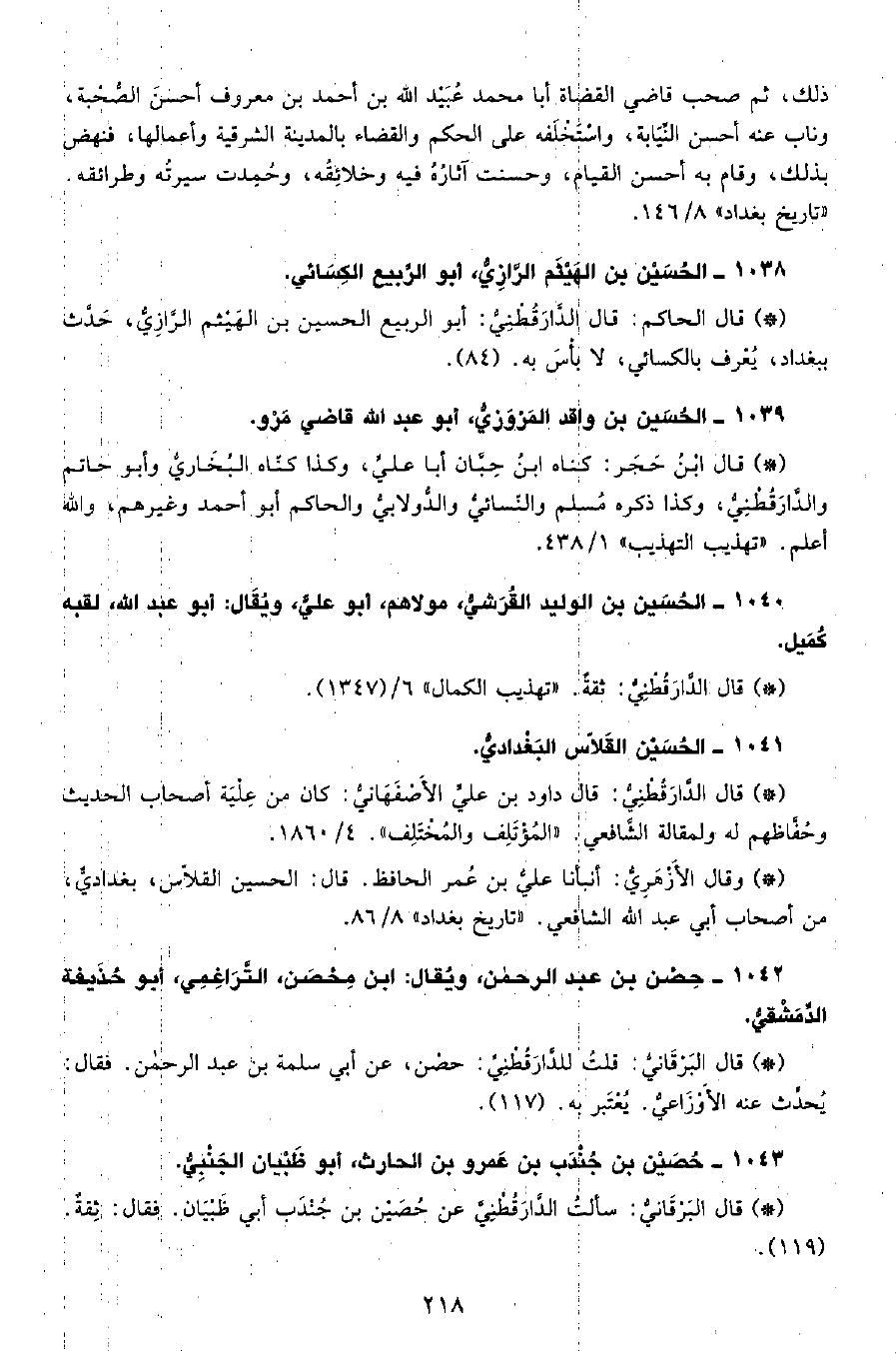 • قال الحاكم: قال الدَّارَقُطْنِيّ: أبو الربيع الحسين بن الهيثم الرازي، حدث ببغداد، يعرف بالكسائي، لا بأس به. (84) .