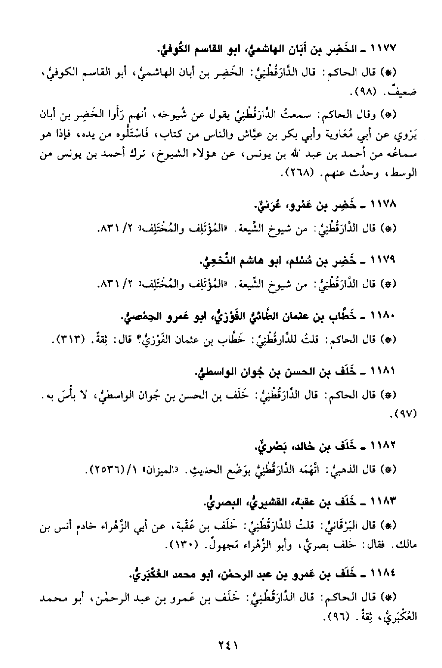 • قال الحاكم: قال الدَّارَقُطْنِيّ: الخضر بن أبان الهاشمي، أبو القاسم الكوفي، ضعيف. (98) .