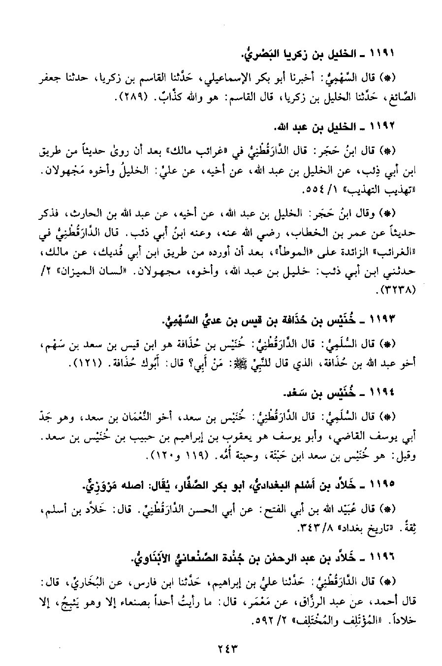 • قال ابن حجر: قال الدَّارَقُطْنِيّ: في «غرائب مالك» بعد أن روى حديثًا من طريق ابن أبي ذئب، عن الخليل بن عبد الله، عن أخيه، عن علي الخليل وأخوه مجهولان. «تهذيب التهذيب» 1 554.