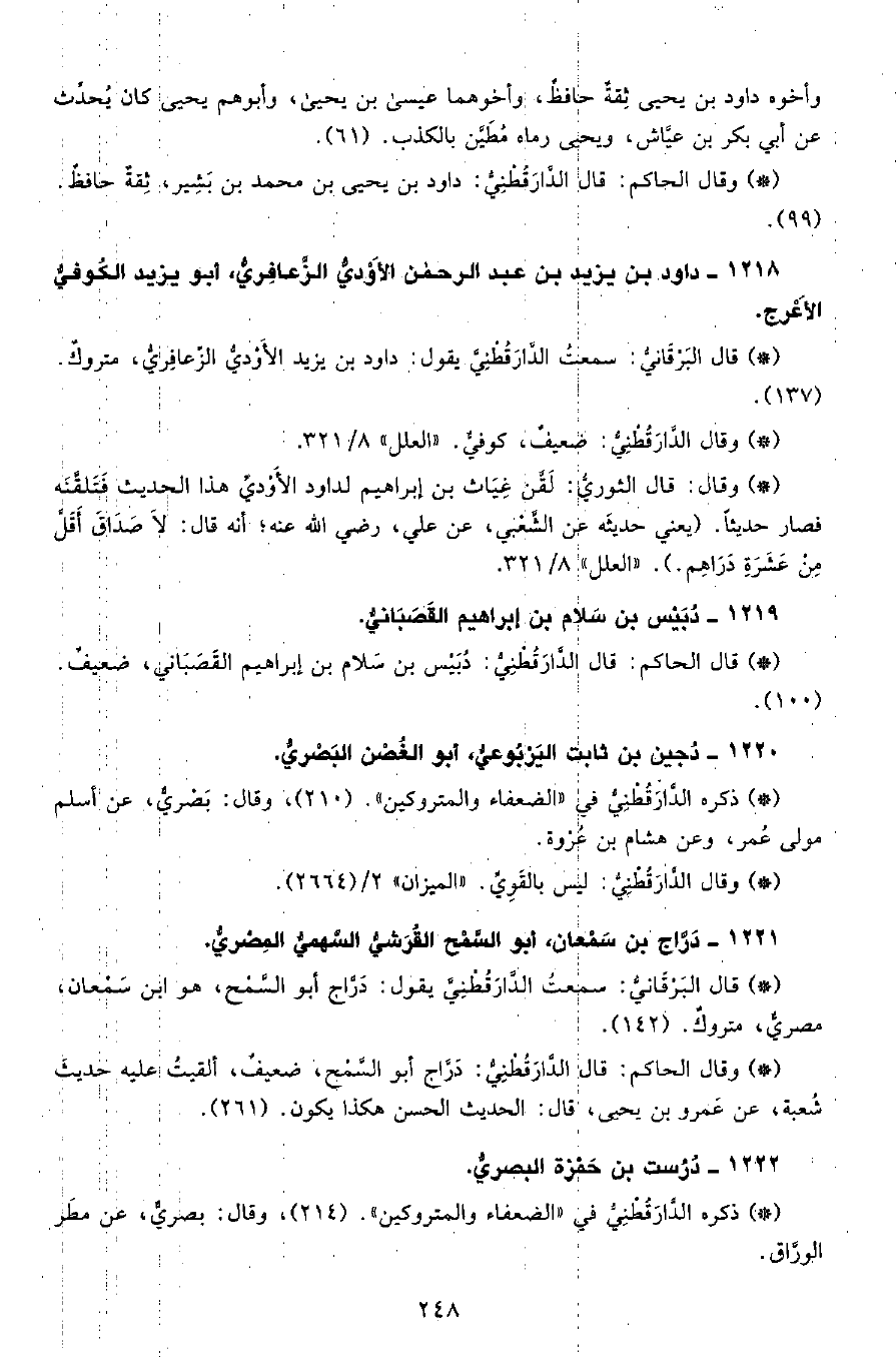 • قال البرقاني: سمعت الدَّارَقُطْنِيّ يقول دراج أبو السمح، هو ابن سمعان، مصري متروك. (142) .