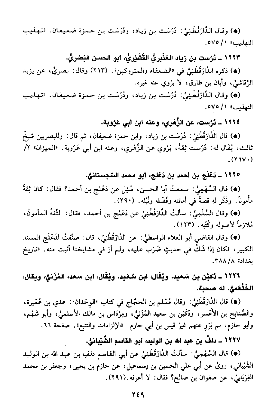 • وقال السلمي: سألت الدَّارَقُطْنِيّ عن دعلج بن أحمد، فقال: الثقة المأمون، ملازمًا لأصوله وكتبه. (123) .