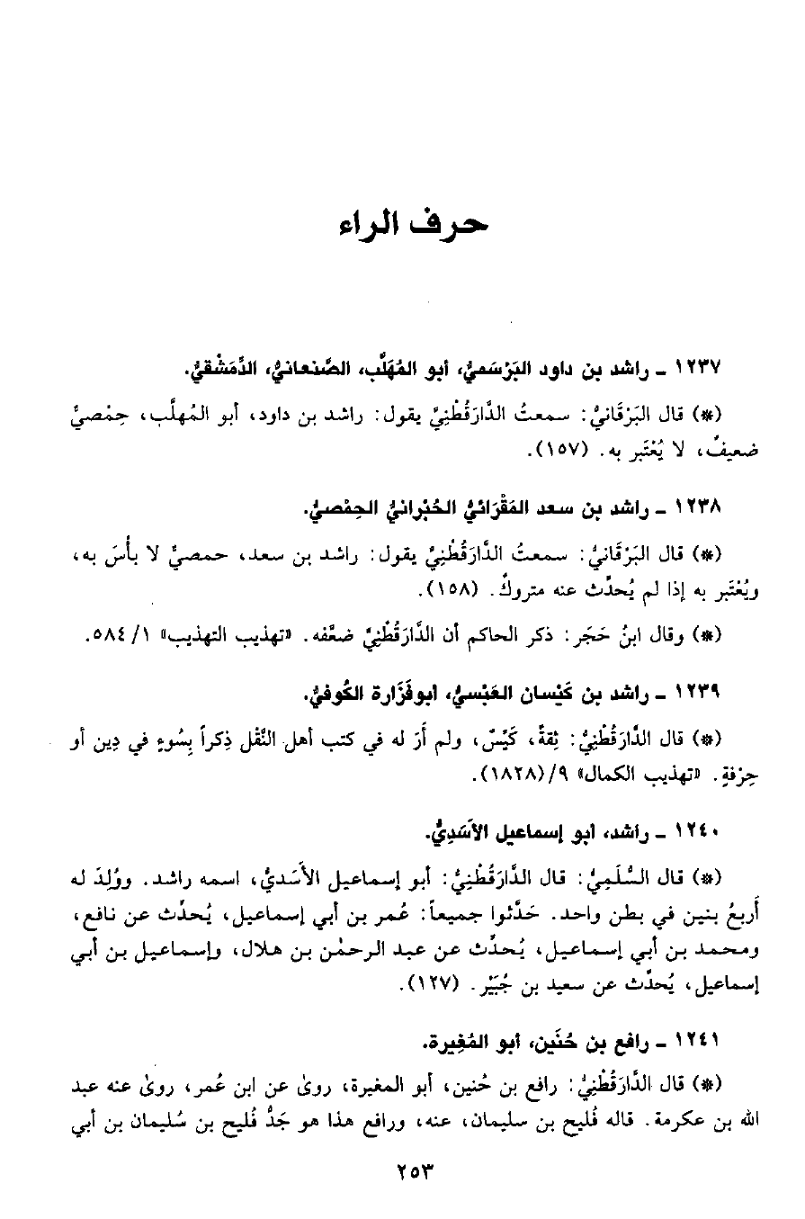 • قال البرقاني: سمعت الدَّارَقُطْنِيّ يقول راشد بن سعد، حمصي لا بأس به، ويعتبر به إذا لم يحدث عنه متروك. (158) .