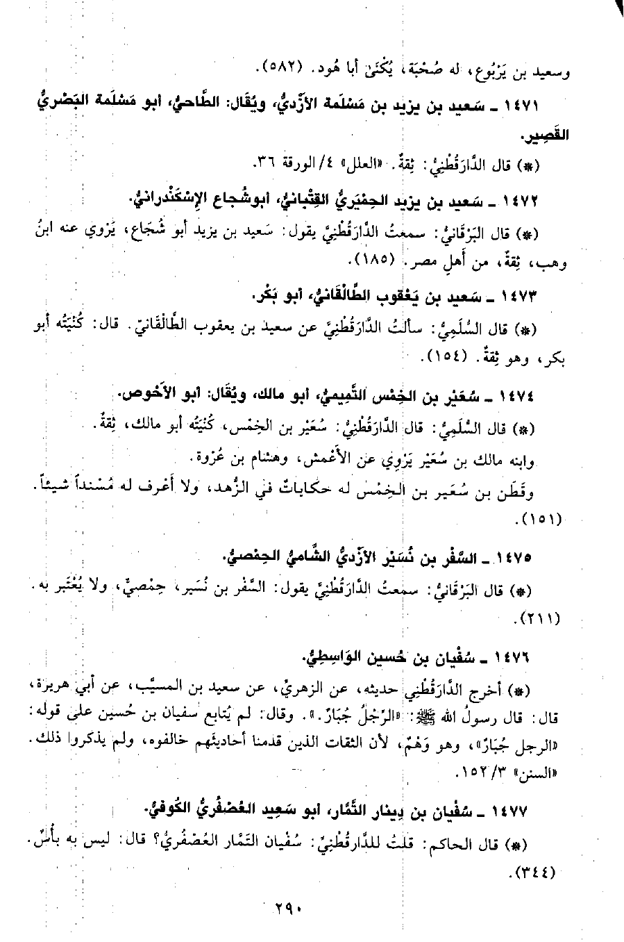 • قال السلمي: سألت الدَّارَقُطْنِيّ عن سعيد بن يعقوب الطالقاني، قال كنيته أبو بكر، وهو ثقة. (154) .