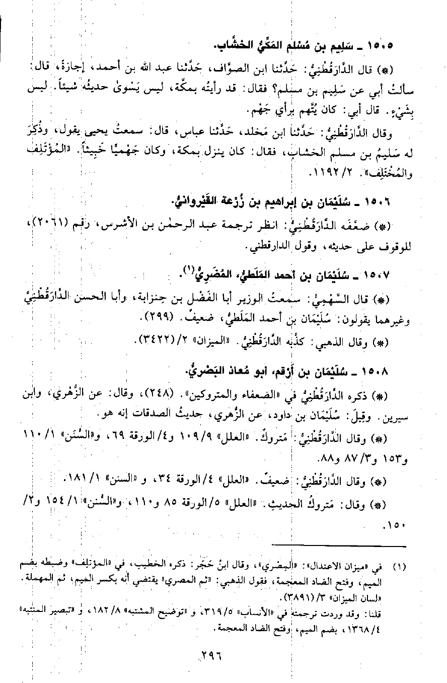 • قال السهمي: سمعت الوزير أبا الفضل بن حنزابة، وأبا الحسن الدَّارَقُطْنِيّ، وغيرهما يقولون سليمان بن أحمد الملطي ضعيف. (299) .