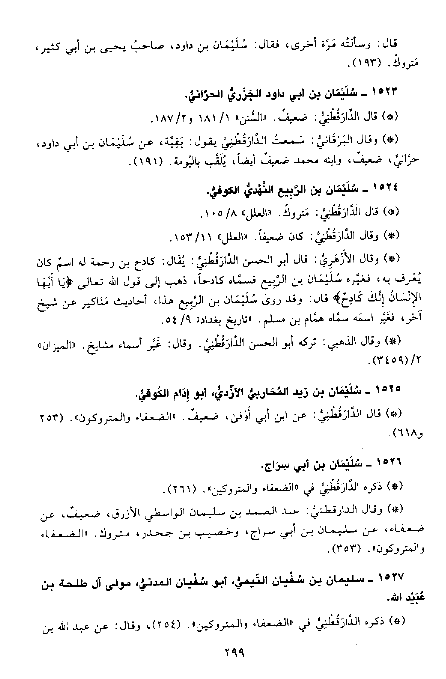 • وقال البرقاني: سمعت الدَّارَقُطْنِيّ يقول بقية، عن سليمان بن أبي داود، حراني، ضعيف، وابنه محمد ضعيف أيضًا، يلقب بالبومة. (191) .