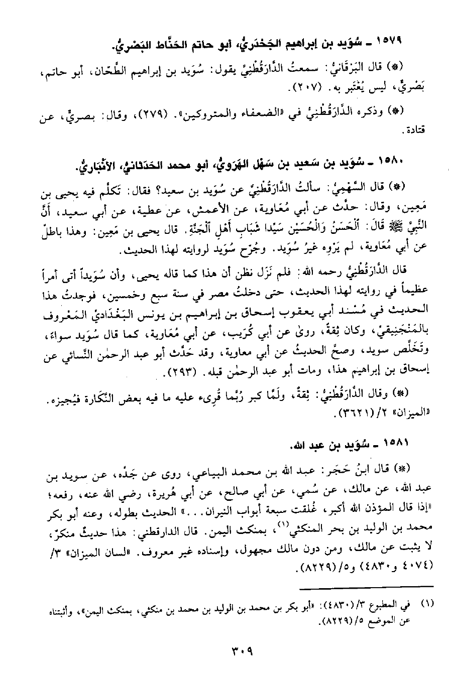 • قال البرقاني: سمعت الدَّارَقُطْنِيّ يقول سويد بن إبراهيم الطحان أبو حاتم، بصري، ليس يعتبر به. (207) .