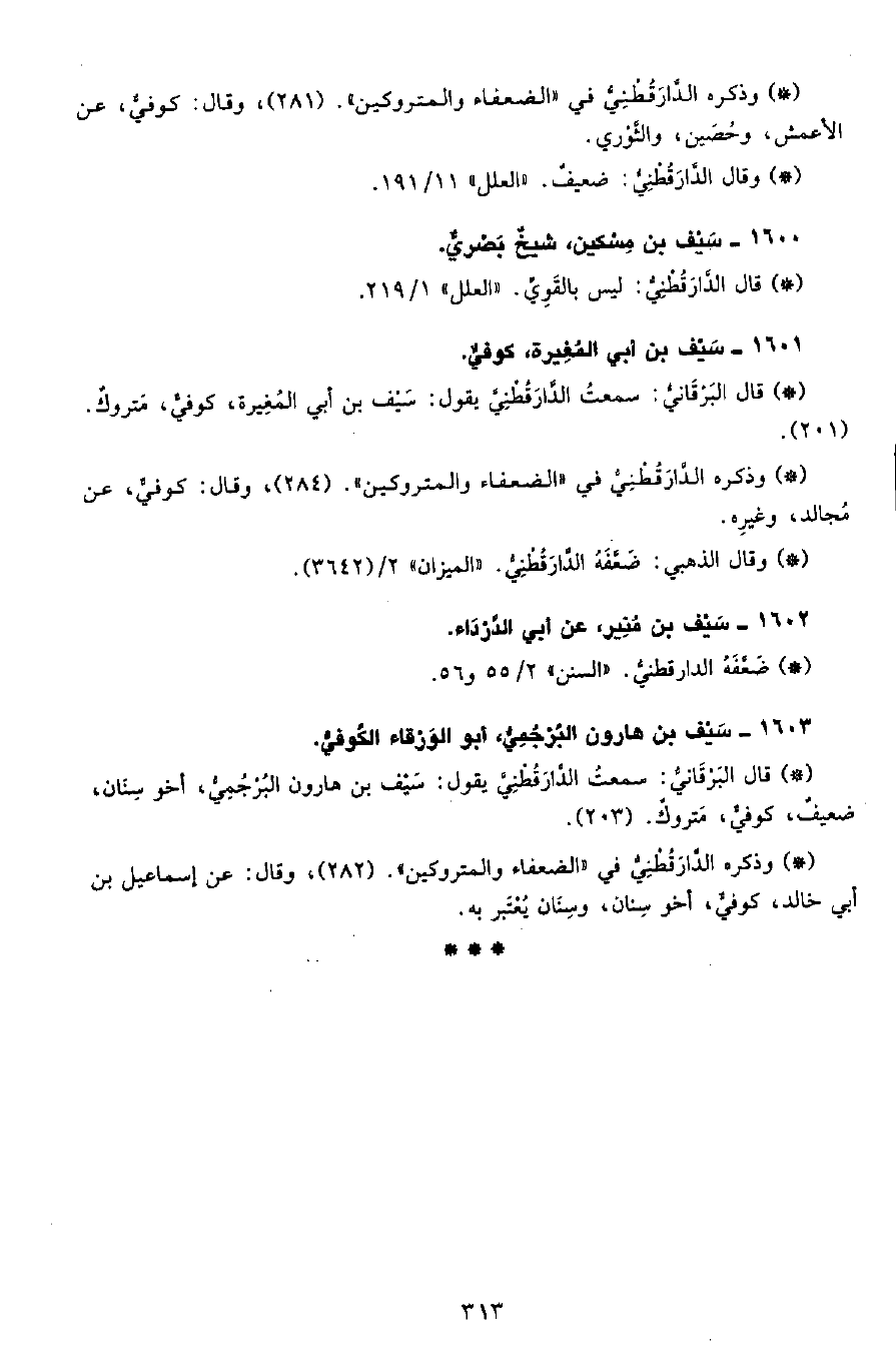 • قال البرقاني: سمعت الدَّارَقُطْنِيّ يقول سيف بن هارون البرجمي، أخو سنان، ضعيف، كوفي، متروك. (203) .
