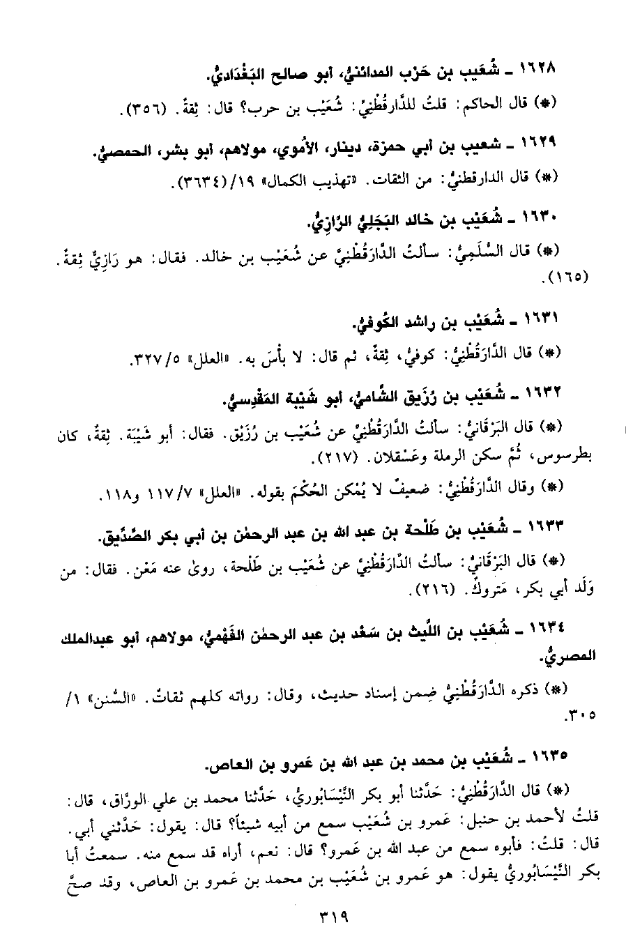 • قال البرقاني: سألت الدَّارَقُطْنِيّ عن شعيب بن طلحة، روى عنه معن، فقال: من ولد أبي بكر، متروك. (216) .