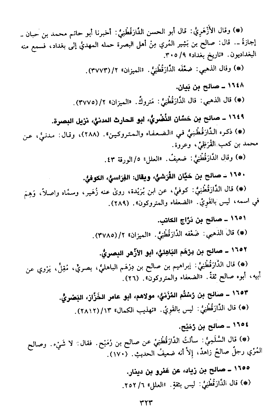 • قال السلمي: سألت الدَّارَقُطْنِيّ عن صالح بن رميح، فقال: لا شيء، وصالح المري رجل صالح زاهد، إلا أنه ضعيف الحديث. (170) .