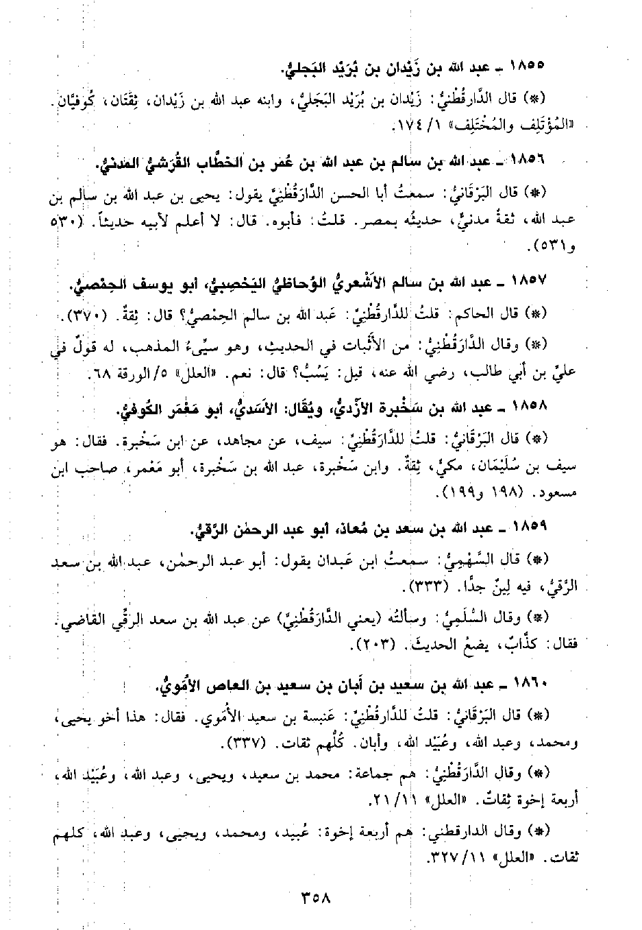 • وقال الدَّارَقُطْنِيّ: من الأثبات في الحديث، وهو سيىء المذهب، له قول في علي بن أبي طالب، رضي الله عنه، قيل يسب؟ قال نعم. «العلل» 5 الورقة 68.