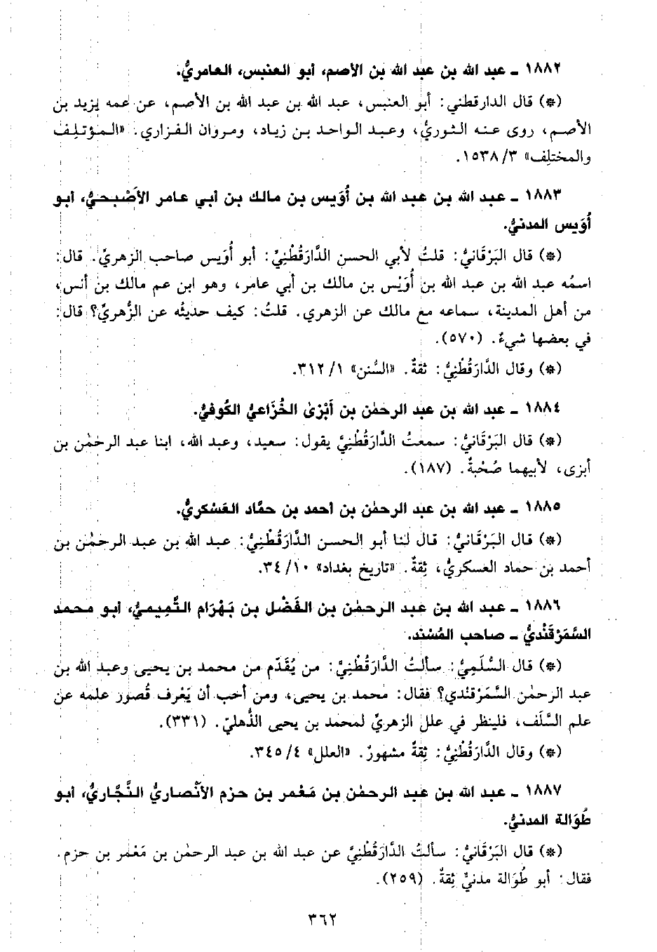 • قال البَرْقانِيّ: سألت الدَّارَقُطْنِيّ عن عبد الله بن عبد الرحمن بن معمر بن حزم، فقال: أبو طوالة مدني ثقة. (259) .