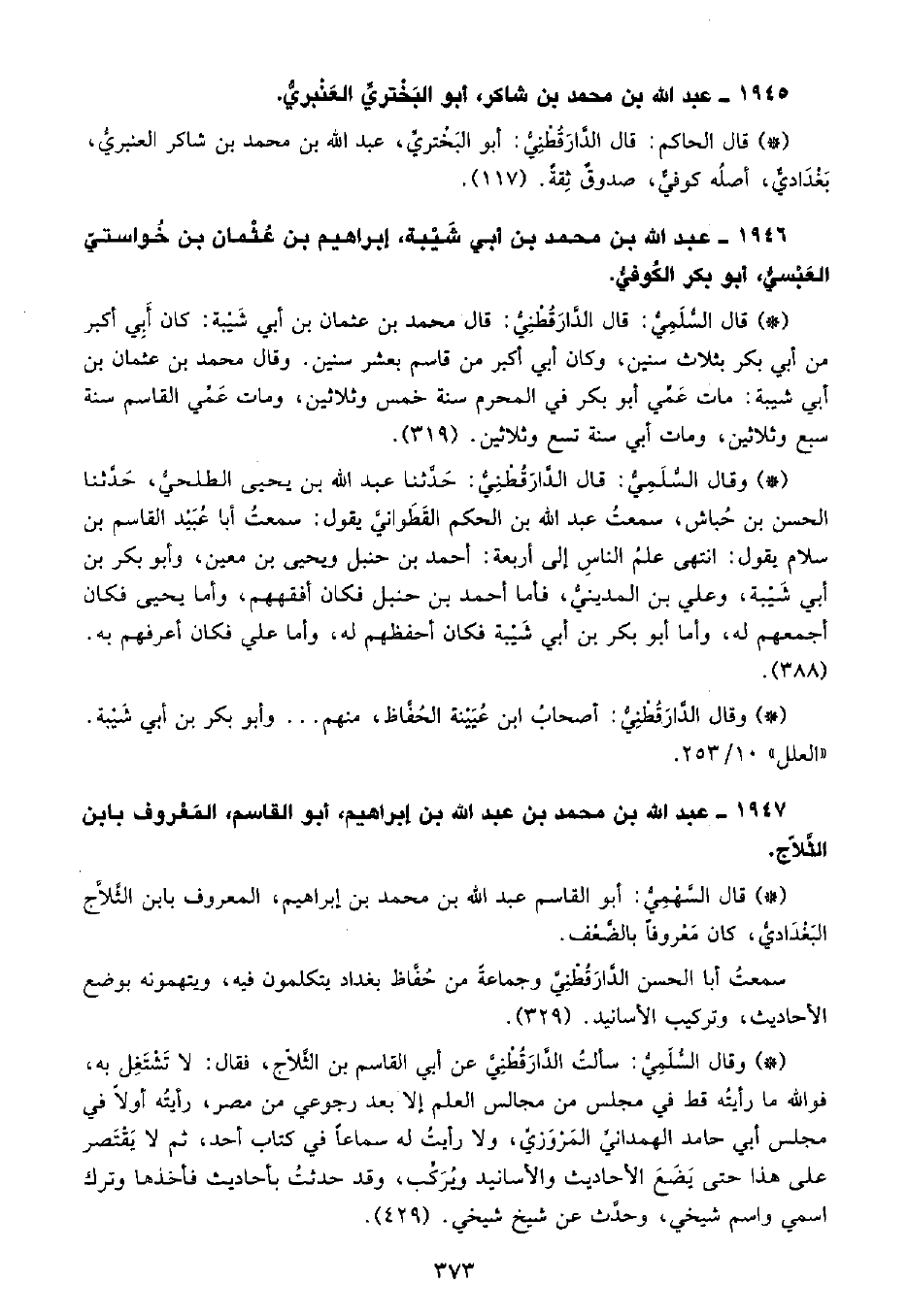 • قال الحاكم: قال الدَّارَقُطْنِيّ: أبو البختري، عبد الله بن محمد بن شاكر العنبري، بغدادي، أصله كوفي، صدوق ثقة. (117) .