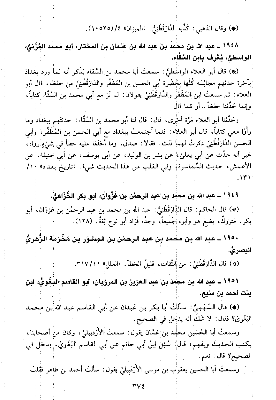 • قال الحاكم: قال الدَّارَقُطْنِيّ: عبد الله بن محمد بن عبد الرحمن بن غزوان، أبو بكر، متروك، يضع هو وأبوه جميعًا، وجده قراد أبو نوح ثقة. (128) .