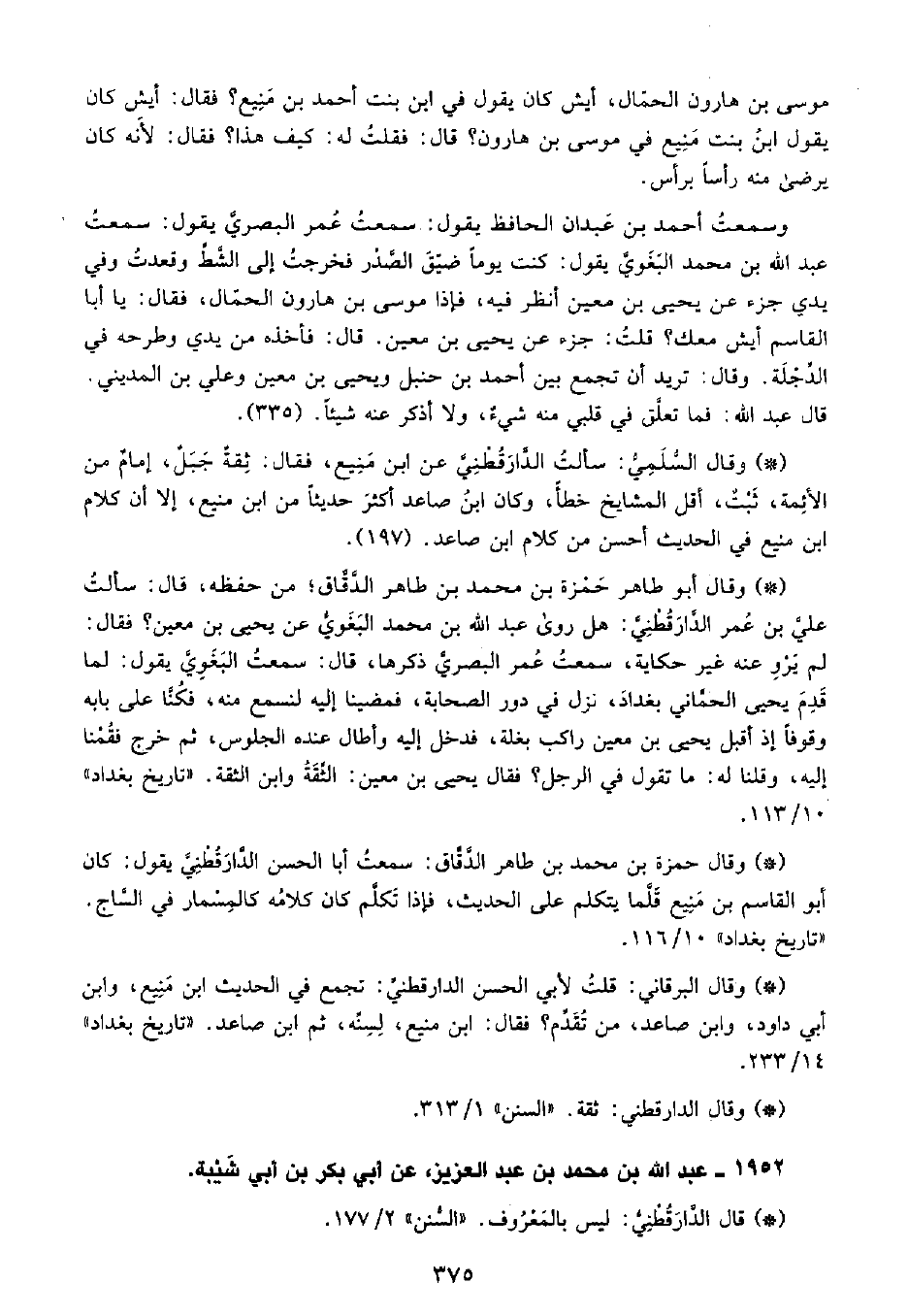• وقال أبو طاهر حمزة بن محمد بن طاهر الدقاق؛ من حفظه، قال سألت علي بن عمر الدَّارَقُطْنِيّ هل روى عبد الله بن محمد البغوي عن يحيى بن معين؟ فقال: لم يرو عنه غير حكاية سَمِعْتُ عمر، البَصْرِيّ ذكرها، قال سَمِعْتُ البغوي يقول لما قدم يحيى الحماني بغداد، نزل في دور الصحابة، فمضينا إليه لنسمع منه، فكنا على بابه وقوفًا إذ أقبل يحيى بن معين راكب بغلة، فدخل إليه وأطال عنده الجلوس، ثم خرج فقمنا إليه، وقلنا له ما تقول في الرجل؟ فقال: يحيى بن معين الثقة وابن الثقة. «تاريخ بغداد» 10 113.