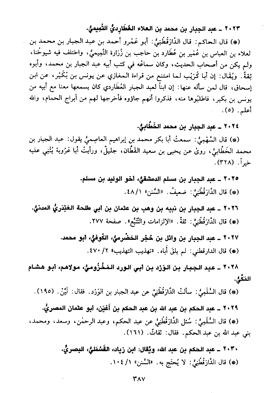 • قال السهمي: سَمِعْتُ أبا بكر محمد بن إبراهيم العاصمي يقول عبد الجبار بن محمد الخطابي، روى عن يحيى بن سعيد القطان، جليل، ورأيت أبا عروبة يثني عليه خيرًا. (328) .