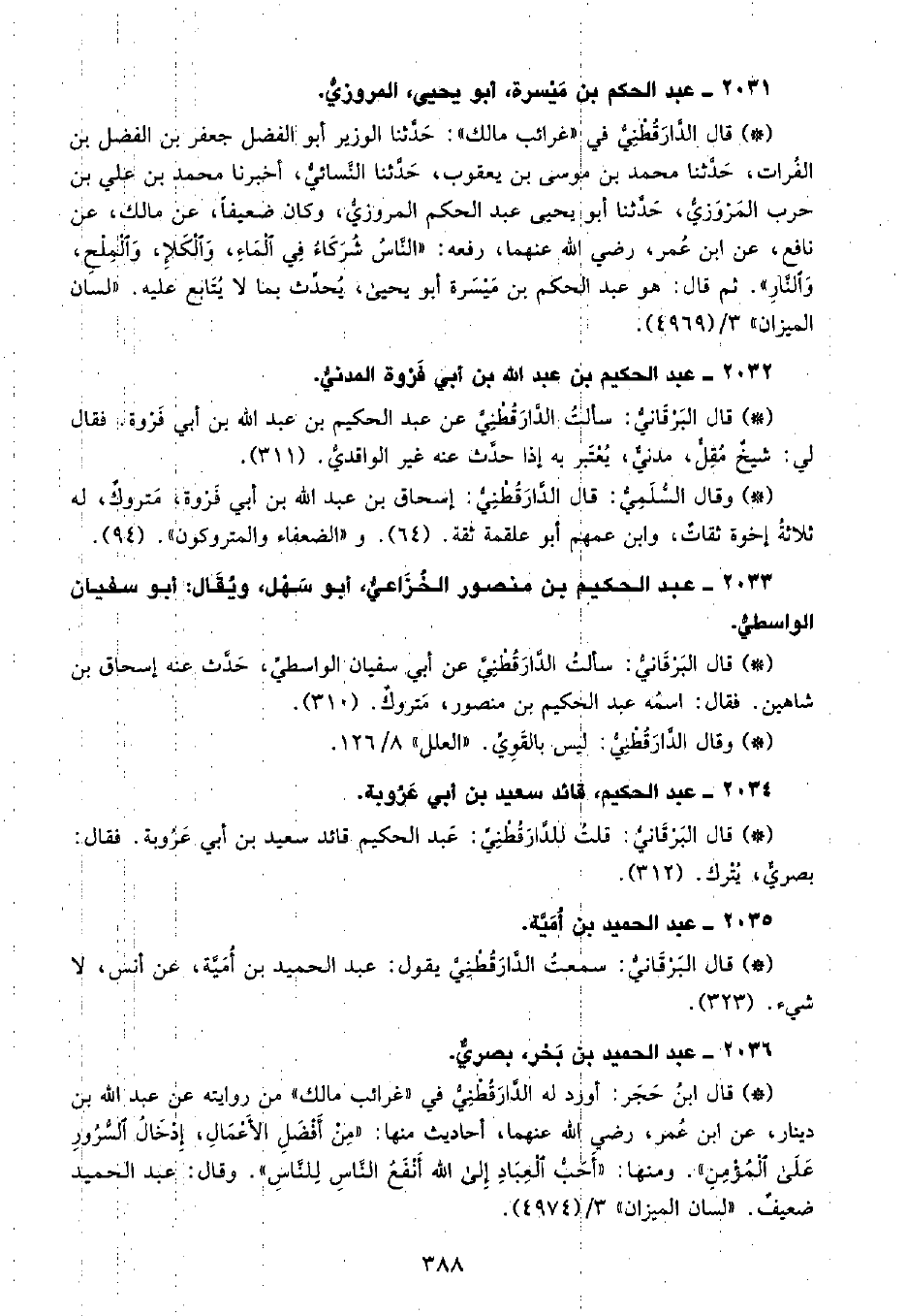 • قال البَرْقانِيّ: سألت الدَّارَقُطْنِيّ عن أبي سفيان الواسطي، حدث عنه إسحاق بن شاهين، فقال: اسمه عبد الحكيم بن منصور، متروك. (310) .
