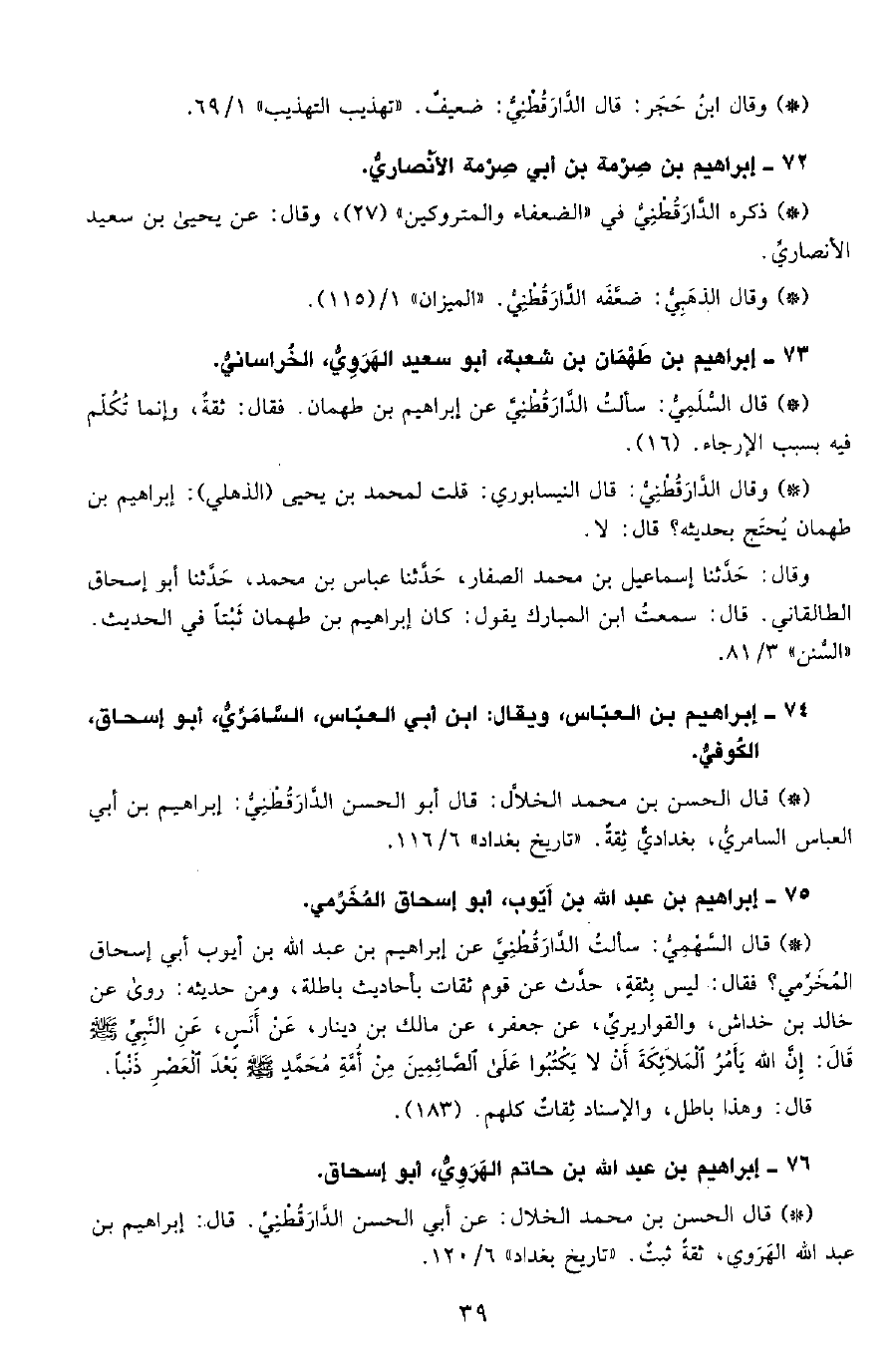 • قال السلمي: سألت الدَّارَقُطْنِيّ عن إبراهيم بن طهمان، فقال: ثقة، وإنما تُكلِّم فيه بسبب الإرجاء. (16) .