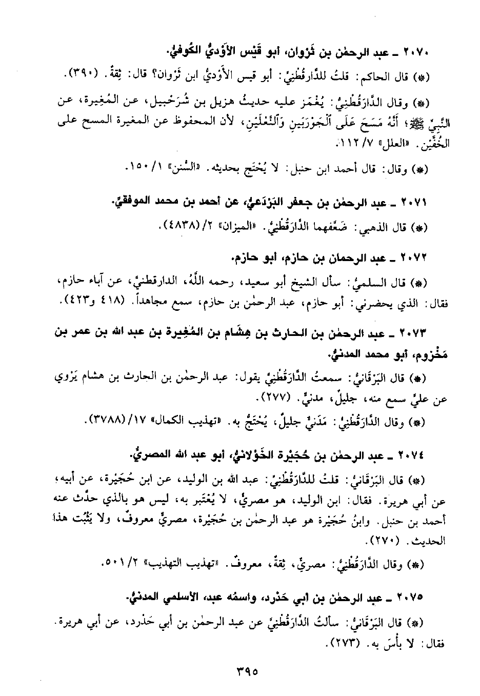 • قال البَرْقانِيّ: سَمِعْتُ الدَّارَقُطْنِيّ يقول عبد الرحمن بن الحارث بن هشام يروي عن علي سمع منه، جليل، مدني. (277) .