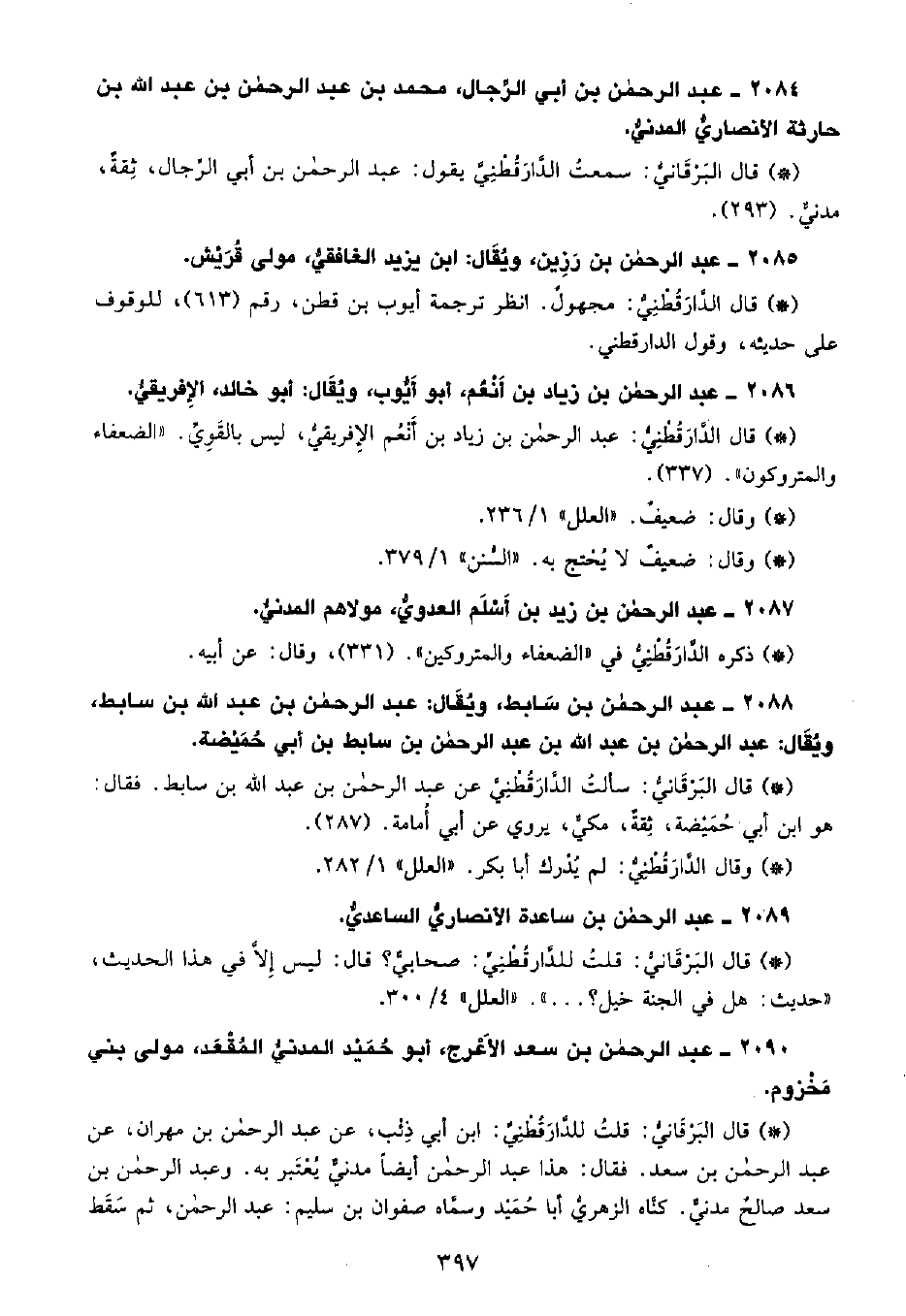 • قال البَرْقانِيّ: سَمِعْتُ الدَّارَقُطْنِيّ يقول عبد الرحمن بن أبي الرجال، ثقة، مدني. (293) .