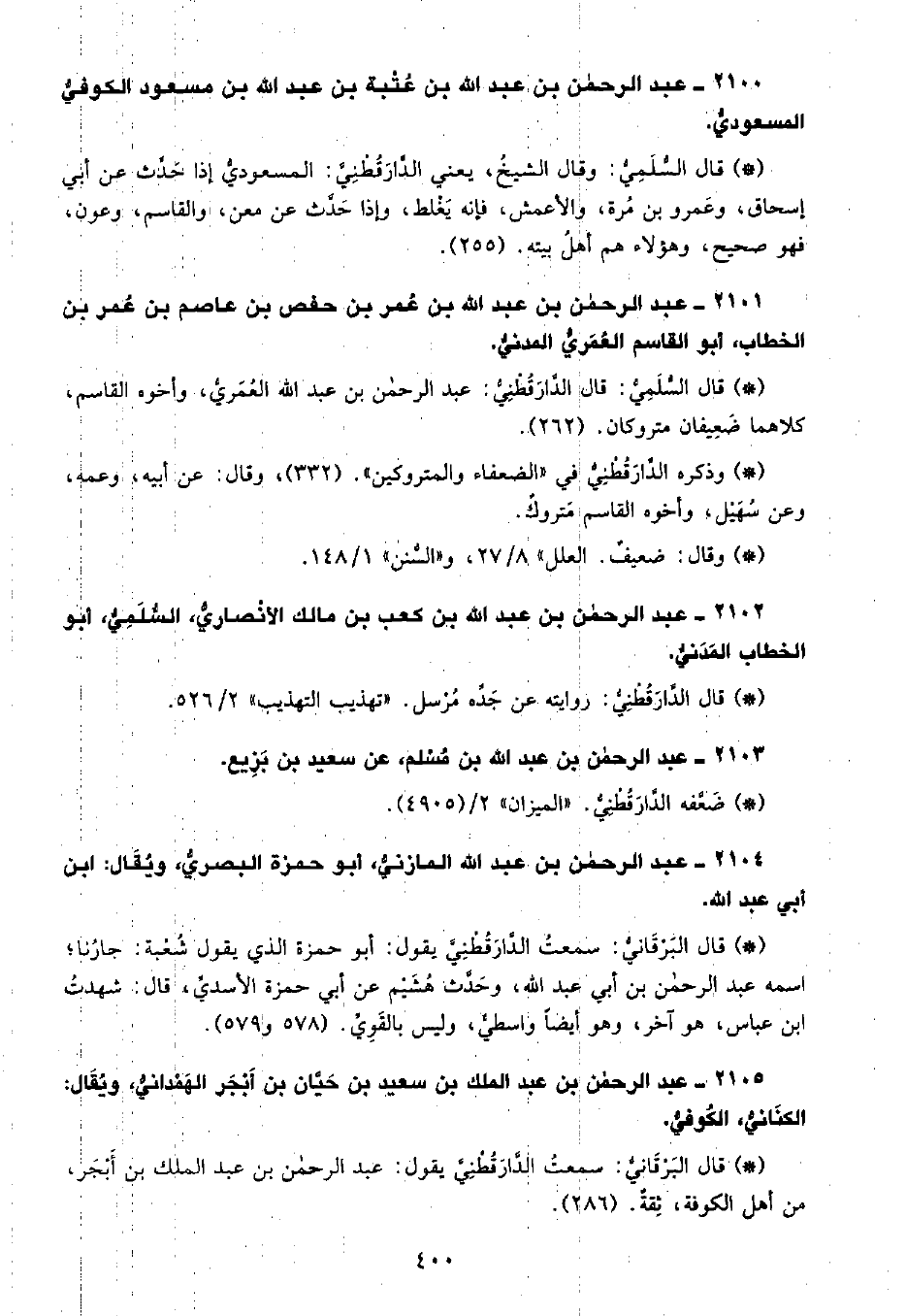 • قال السُّلَمِيُّ: قال الدَّارَقُطْنِيّ: عبد الرحمن بن عبد اللهِ العمري، وأخوه القاسم، كلاهما ضعيفان متروكان. (262) .