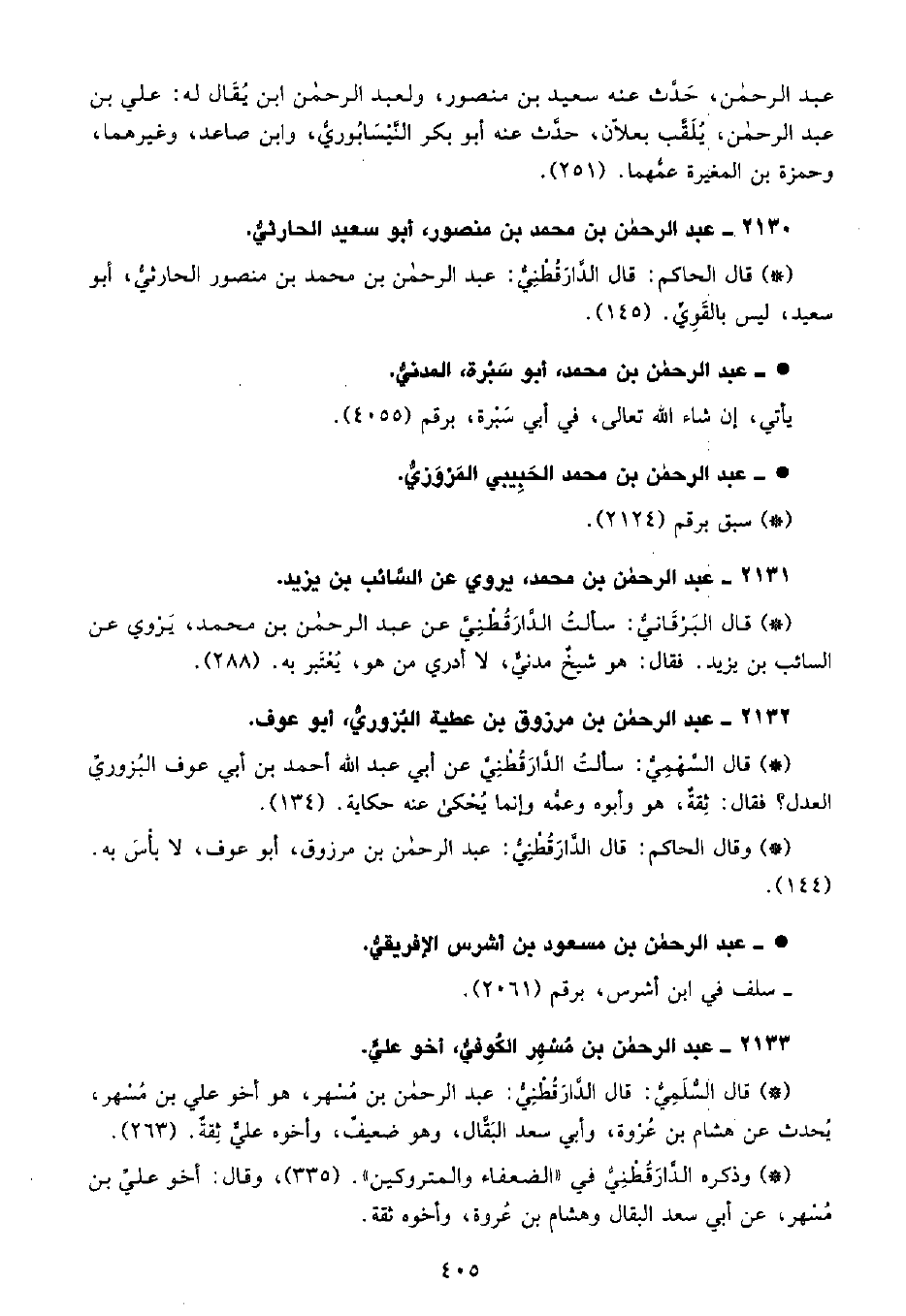 • قال الحاكم: قال الدَّارَقُطْنِيّ: عبد الرحمن بن محمد بن منصور الحارثي، أبو سعيد، ليس بالقوي. (145) .