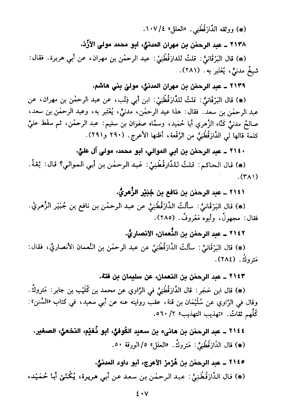 • قال البَرْقانِيّ: سألت الدَّارَقُطْنِيّ عن عبد الرحمن بن نافع بن جبير الزهري، فقال: مجهول، وأبوه معروف. (285) .