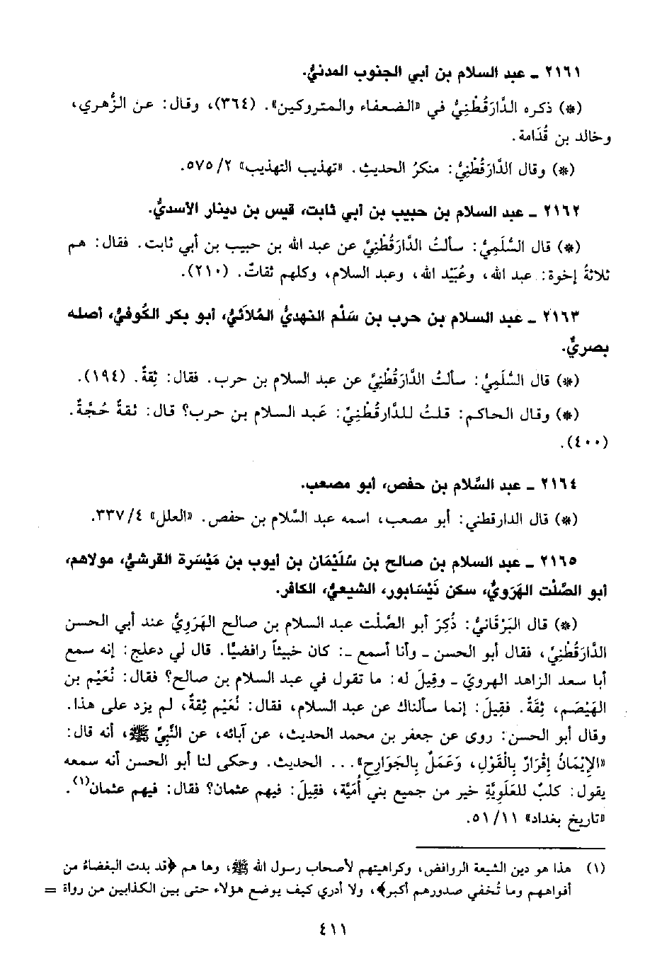 • قال البَرْقانِيّ: ذكر أبو الصلت عبد السلام بن صالح الهروي عند أبي الحسن الدَّارَقُطْنِيّ، فقال: أبو الحسن - وأنا أسمع - كان خبيثًا رافضيًا، قال لي دعلج إنه سمع أبا سعد الزاهد الهروي - وقيل له ما تقول في عبد السلام بن صالح؟ فقال: نعيم بن الهيصم ثقة، فقيل إنما سألناك عن عبد السلام، فقال: نعيم ثقة، لم يزد على هذا، وقال أبو الحسن روى عن جعفر بن محمد الحديث، عن آبائه، عن النبي - صلى الله عليه وسلم -، أنه قال «الإيمان إقرار بالقول، وعمل بالجوارح» ... الحديث، وحكى لنا أبو الحسن أنه سمعه يقول كلب للعلوية خير من جميع بني أمية، فقيل فيهم عثمان؟ فقال: فيهم عثمان. «تاريخ بغداد» 11 51.