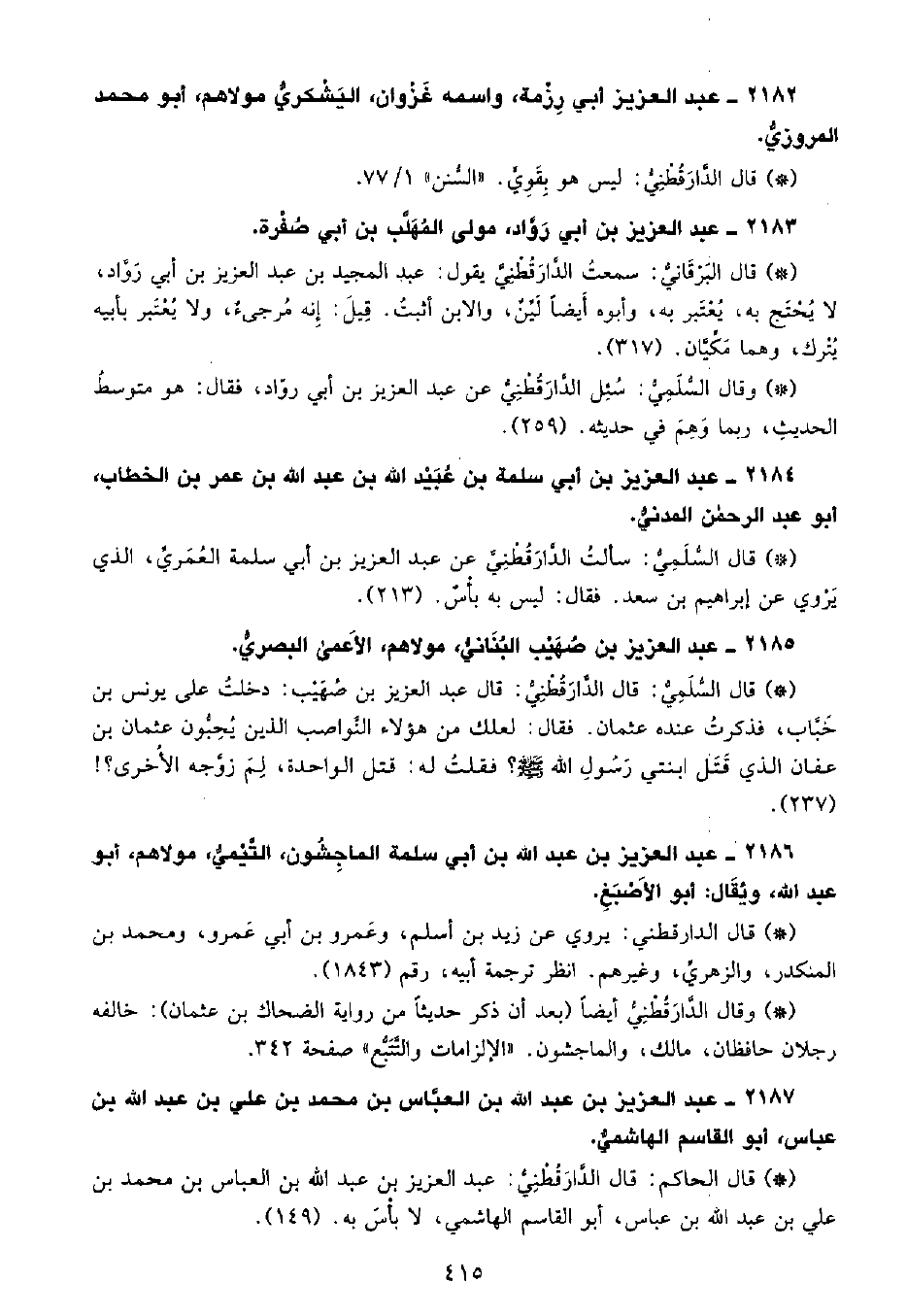 • قال السُّلَمِيُّ: سألت الدَّارَقُطْنِيّ عن عبد العزيز بن أبي سلمة العمري، الذي يروي عن إبراهيم بن سعد، فقال: ليس به بأس. (213) .