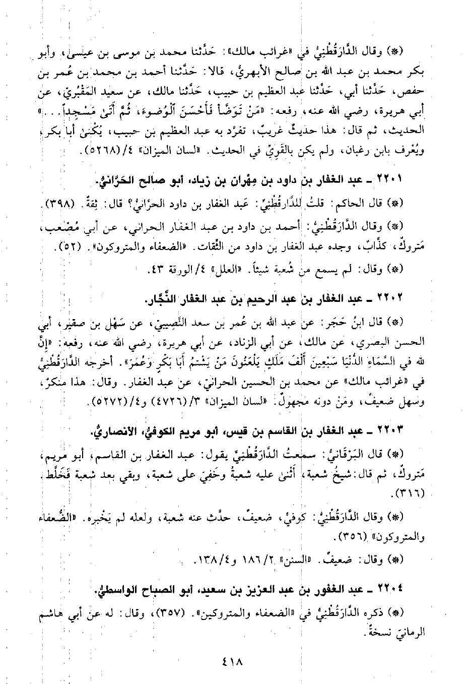 • قال البَرْقانِيّ: سَمِعْتُ الدَّارَقُطْنِيّ يقول عبد الغفار بن القاسم، أبو مريم، متروك، ثم قال شيخ شعبة، أثنى عليه شعبة وخفي على شعبة، وبقي بعد شعبة فخلط. (316) .