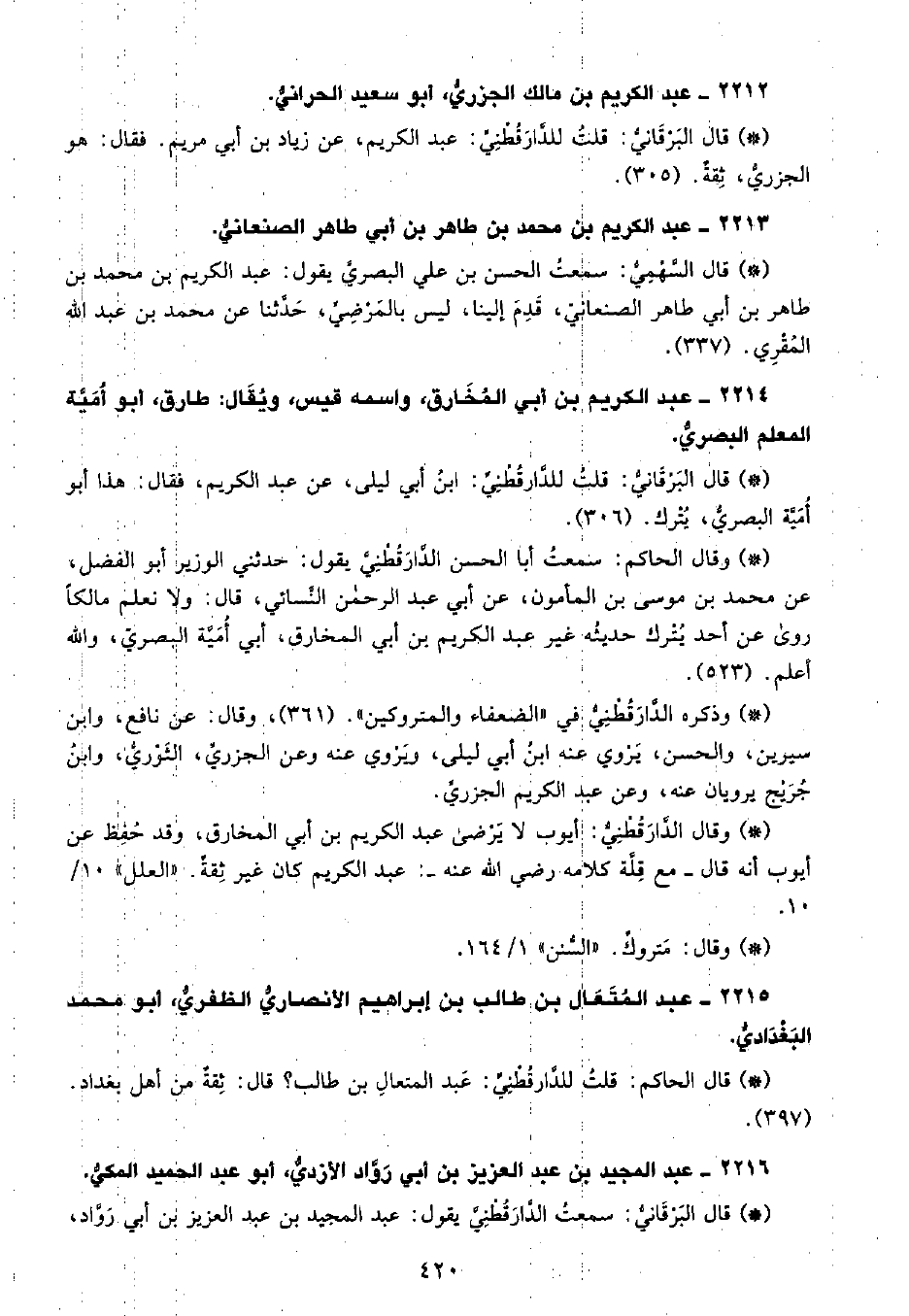 • قال البَرْقانِيّ: قلتُ للدَّارَقُطْنِيِّ ابن أبي ليلى، عن عبد الكريم، فقال: هذا أبو أمية، البَصْرِيّ، يترك. (306) .