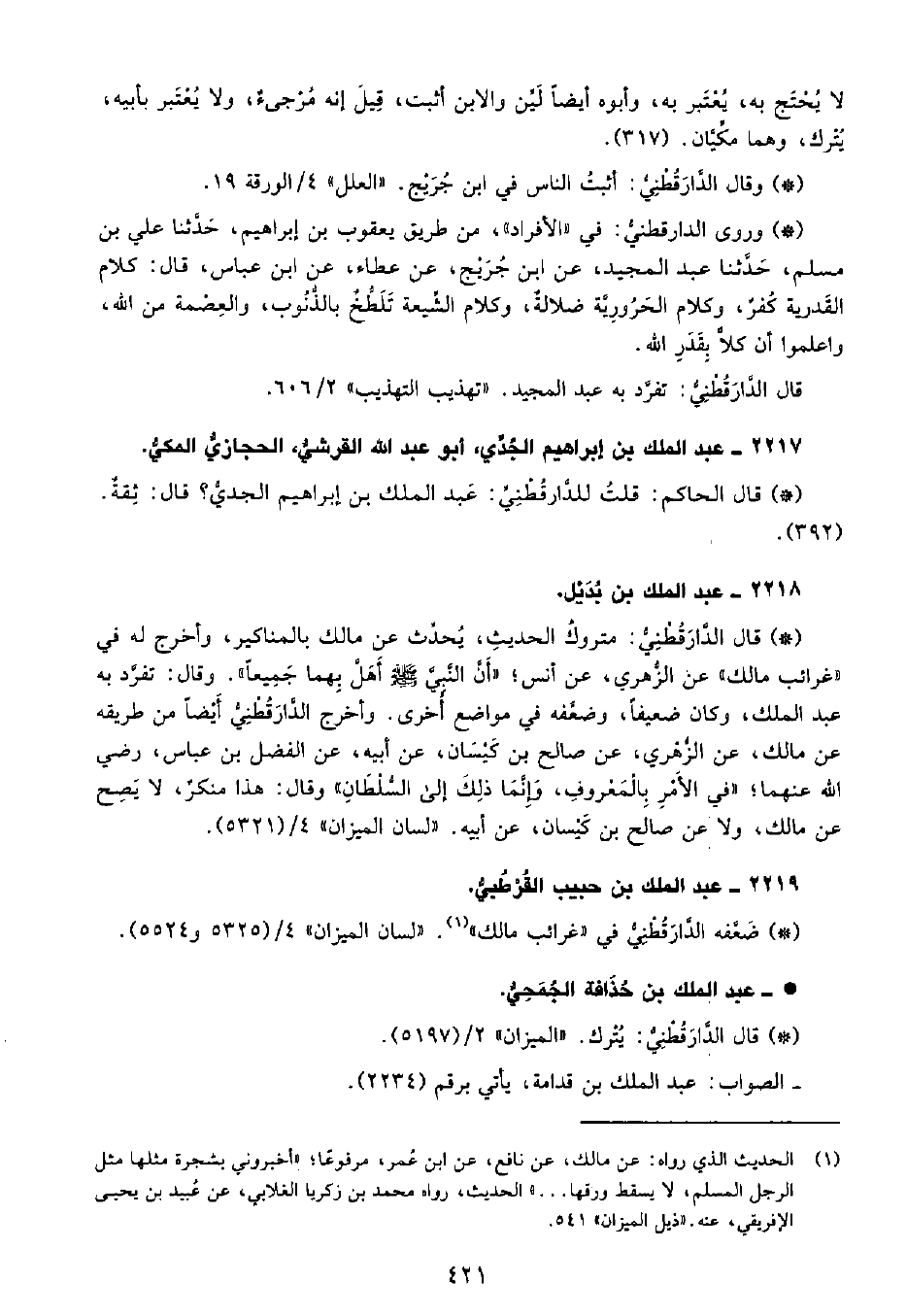 • قال الدَّارَقُطْنِيّ: متروك الحديث، يحدث عن مالك بالمناكير، وأخرج له في «غرائب مالك» عن الزهري، عن أنس؛ «أن النبي - صلى الله عليه وسلم - أهل بهما جميعًا» ، وقال تفرد به عبد الملك، وكان ضعيفًا، وضعفه في مواضع أخرى، وأخرج الدَّارَقُطْنِيّ أيضًا من طريقه عن مالك، عن الزهري، عن صالح بن كيسان، عن أبيه، عن الفضل بن عباس، رضي الله عنهما؛ «في الأمر بالمعروف، وإنما ذلك إلي السلطان» ، وقال هذا منكر، لا يصح عن مالك، ولا عن صالح بن كيسان، عن أبيه. «لسان الميزان» 4 (5321) .