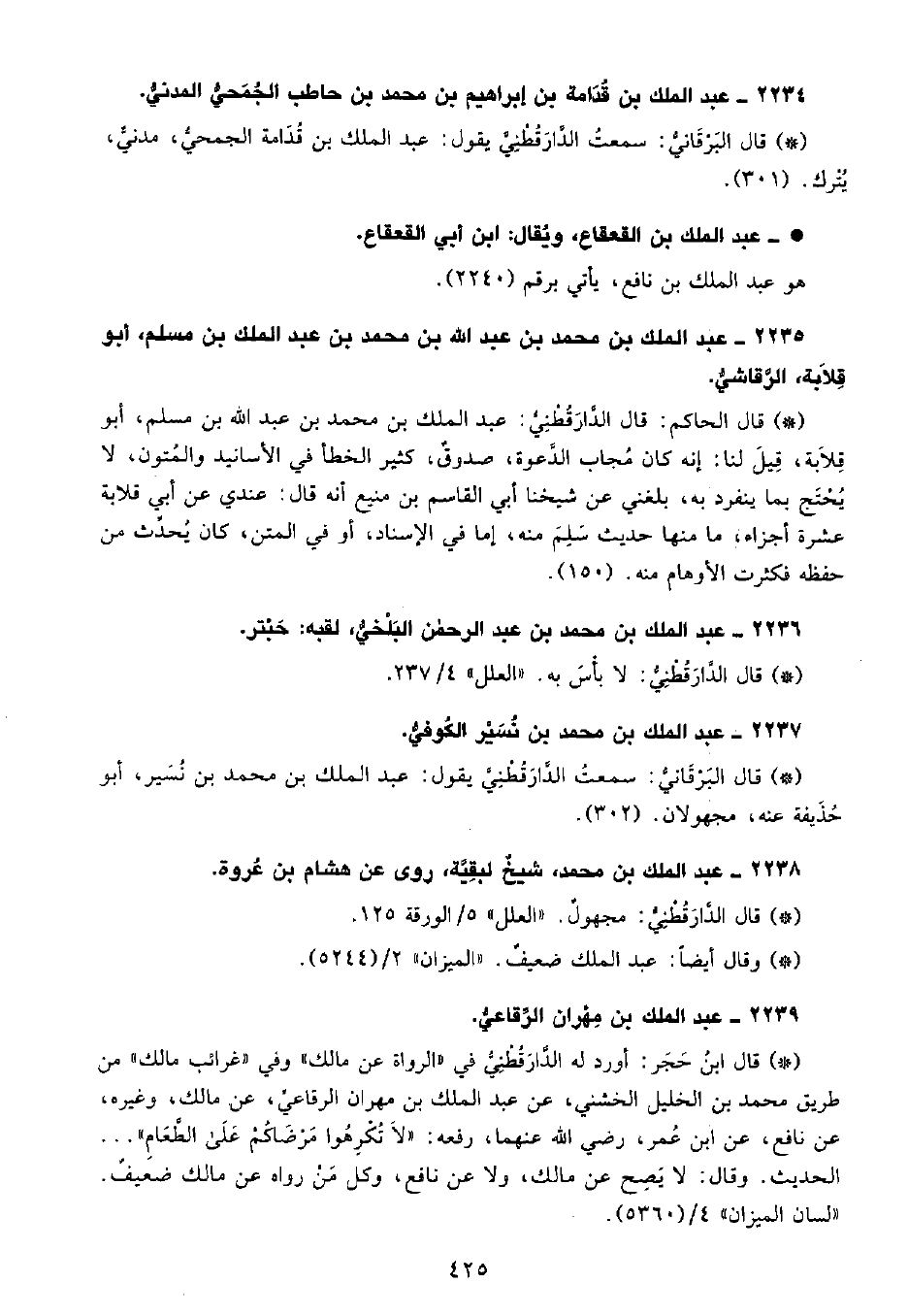 • قال البَرْقانِيّ: سَمِعْتُ الدَّارَقُطْنِيّ يقول عبد الملك بن قدامة الجمحي، مدني، يترك. (301) .