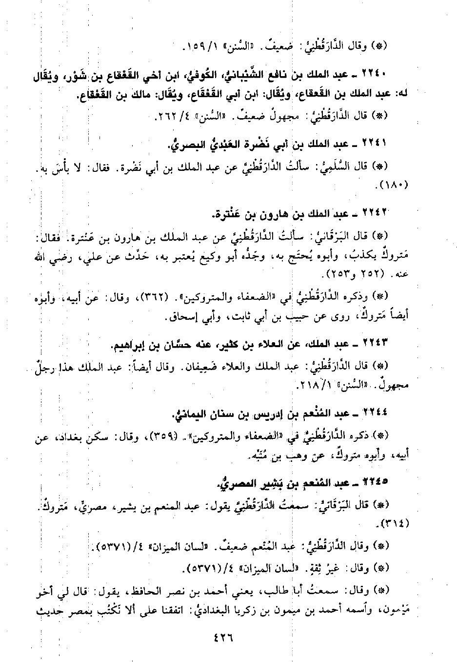 • قال الدَّارَقُطْنِيّ: عبد الملك والعلاء ضعيفان، وقال أيضًا عبد الملك هذا رجل مجهول. «السنن» 1 218.
