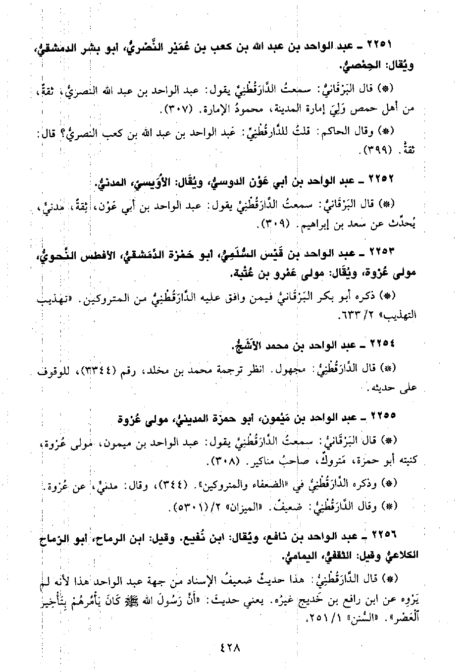 • قال البَرْقانِيّ: سَمِعْتُ الدَّارَقُطْنِيّ يقول عبد الواحد بن أبي عون، ثقة، مدني، يحدث عن سعد بن إبراهيم. (309) .